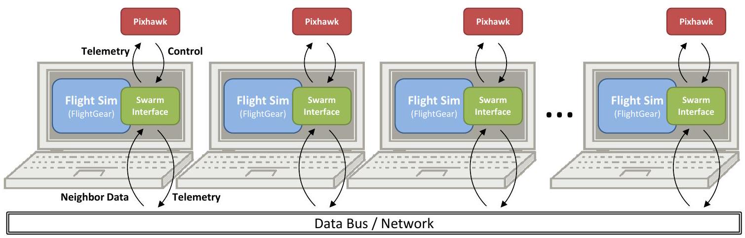 图5. 仿真链。每台计算机运行一个独立的仿真实例,广播其无人机的仿真遥测数据,同时接收并处理来自其他仿真的遥测数据。