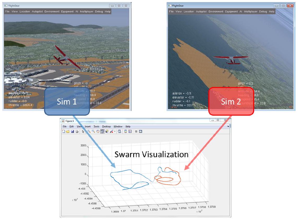 图6. 使用FlightGear的仿真链。两个同时运行的FlightGear实例通过UDP包广播仿真状态。截获这些包后,各实例蜂群接口可将邻近无人机投射进自身环境,仿佛它们共同飞行。