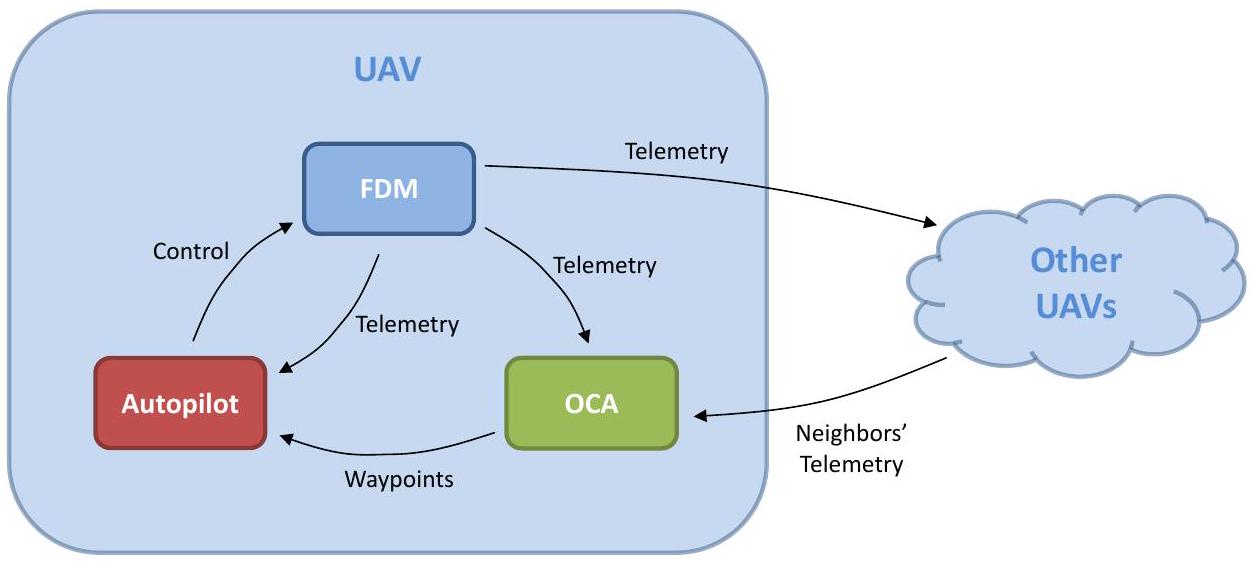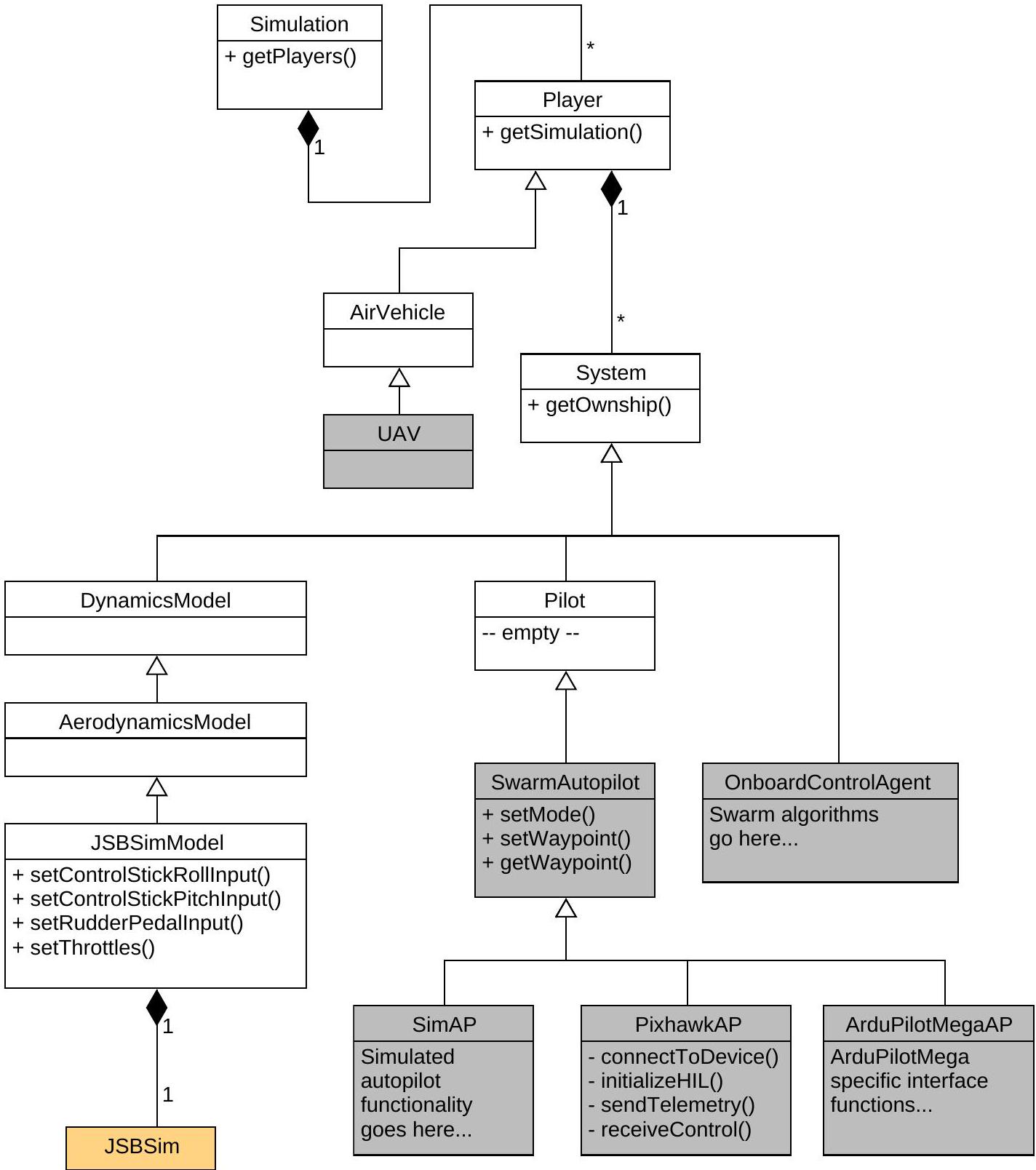 在开发过程中,蜂群开发者必须能够轻松添加、修改和删除蜂群组件,而不会对仿真的其他部分产生不良影响。因此,整个框架应具备高度模块化——即系统由各部分组成,这些部分能干净分离且相互契合的特性[35]。模块化设计简化了各种蜂群配置和场景的测试,包括不同目标、飞行器、蜂群算法、自动驾驶仪及其他系统/子系统的组合。