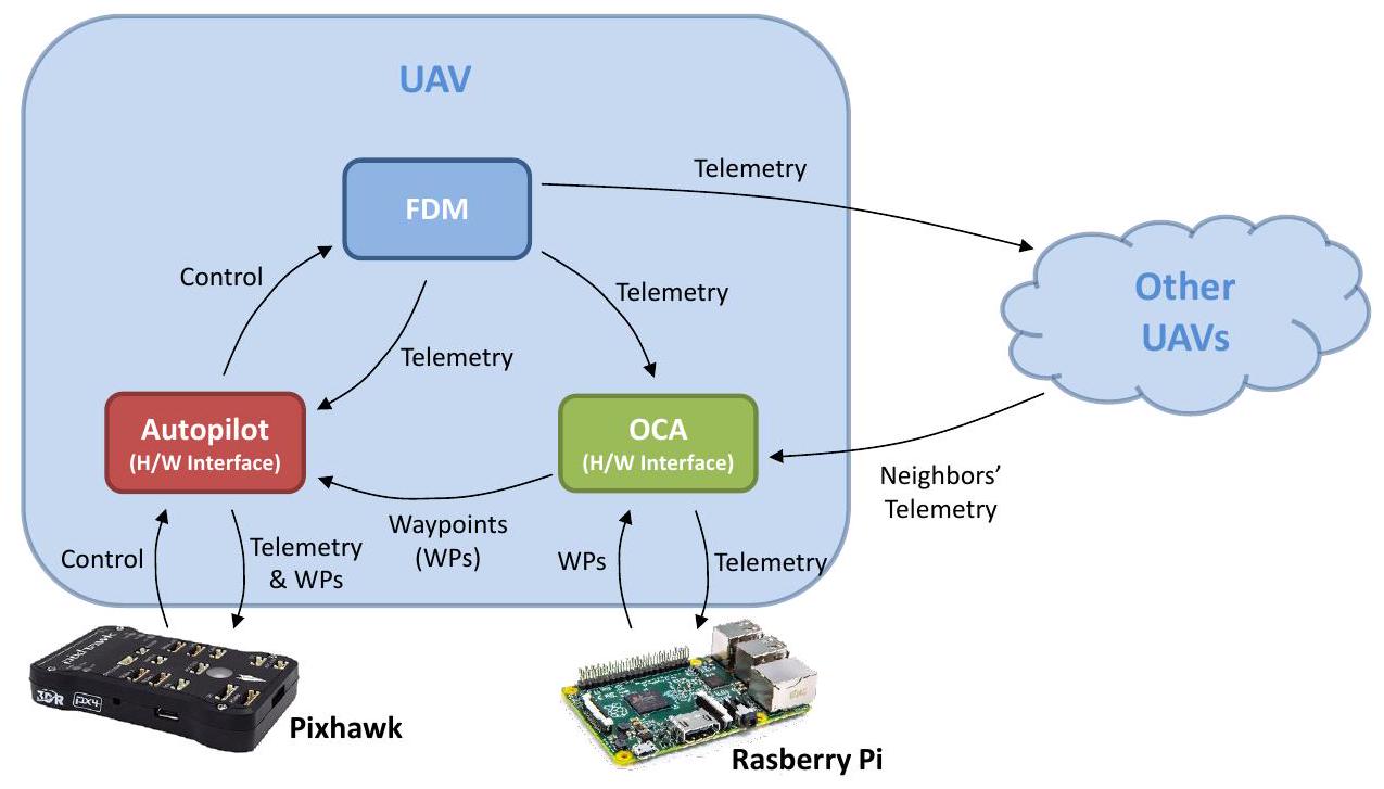 未来研究方向之一是为 OCA 实现硬件接口,使得每个硬件 OCA 可通过无线连接等方式在仿真外部与其他 UAV 的 OCA 交互,模拟真实 UAV 点对点通信。将此类交互迁移出仿真环境,不仅提升实际飞行测试的信心,也减轻仿真计算负担,从而释放资源以提升蜂群规模。