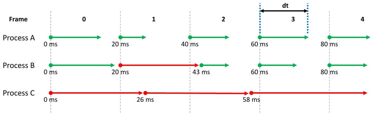 图33. 性能图 - 单架蜂群无人机(HIL)。该图展示了一次 10 分钟仿真中,包含一架集成 Pixhawk 自动驾驶仪(HIL 仿真)和三架使用模拟自动驾驶仪的导航无人机的更新时长。两个局部峰值中较小的峰值(约 17 ms)显示了在主刷新周期外资源利用率的周期性升高,即 10 Hz 频率的 HIL_GPS MAVLink 消息生成与传输。