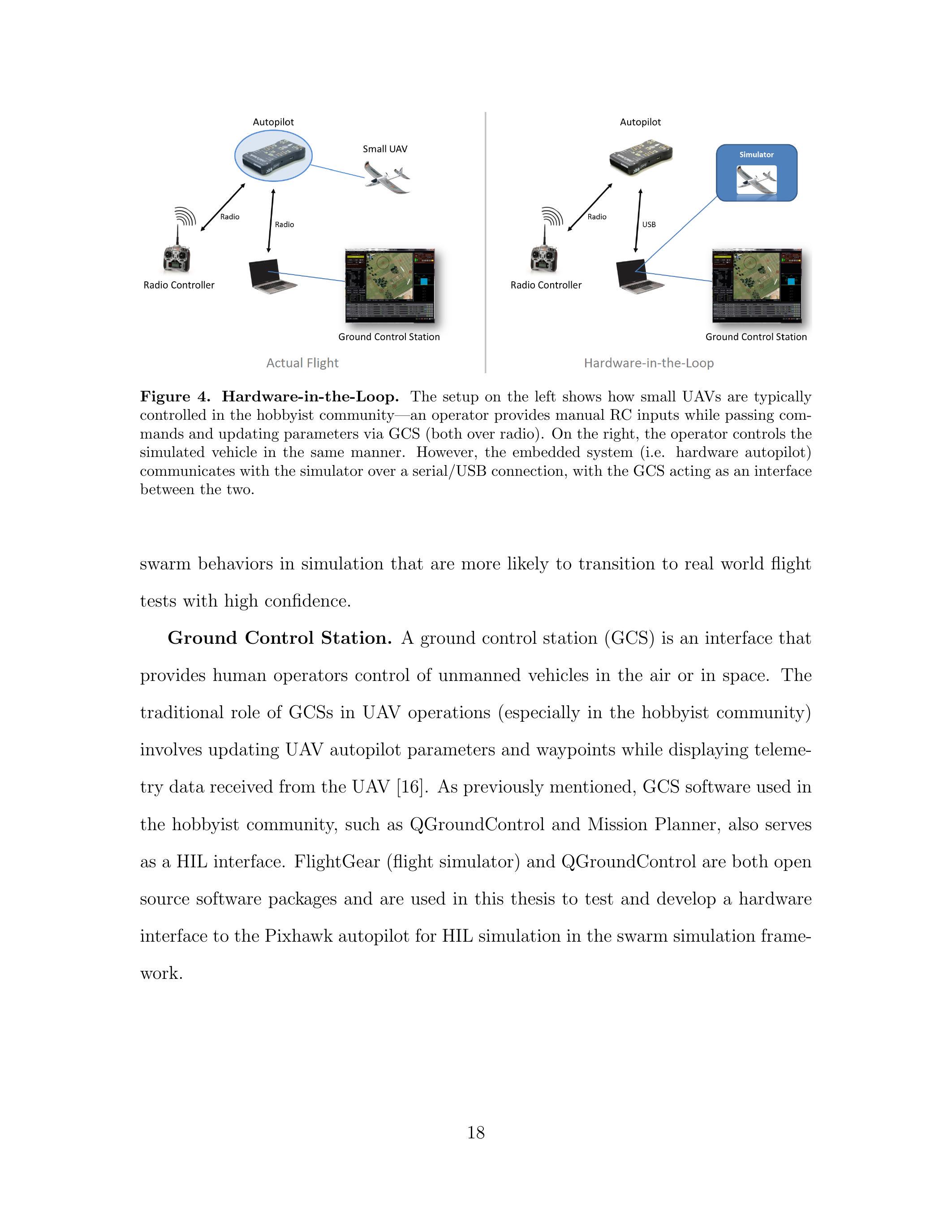 图4. 硬件在环。左图显示了业余社区典型的无人机控制设置——操作者通过无线电提供手动RC输入,同时通过GCS(均经无线电)发送指令和更新参数。右图中,操作者以同样方式控制仿真飞行器,但嵌入式系统(即硬件自动驾驶仪)通过串口/USB连接与仿真器通信,GCS作为两者间的接口。
