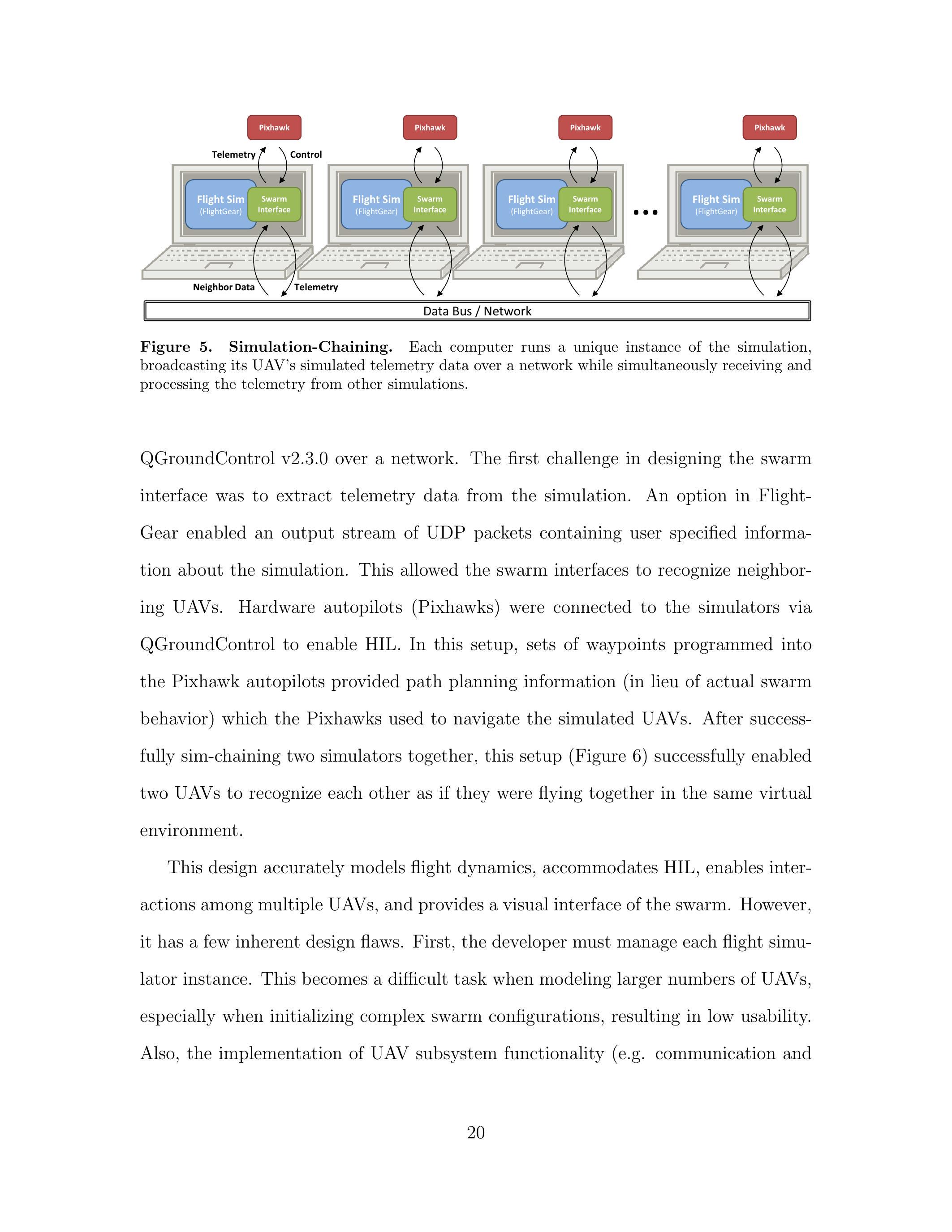 图5. 仿真链。每台计算机运行一个独立的仿真实例,广播其无人机的仿真遥测数据,同时接收并处理来自其他仿真的遥测数据。