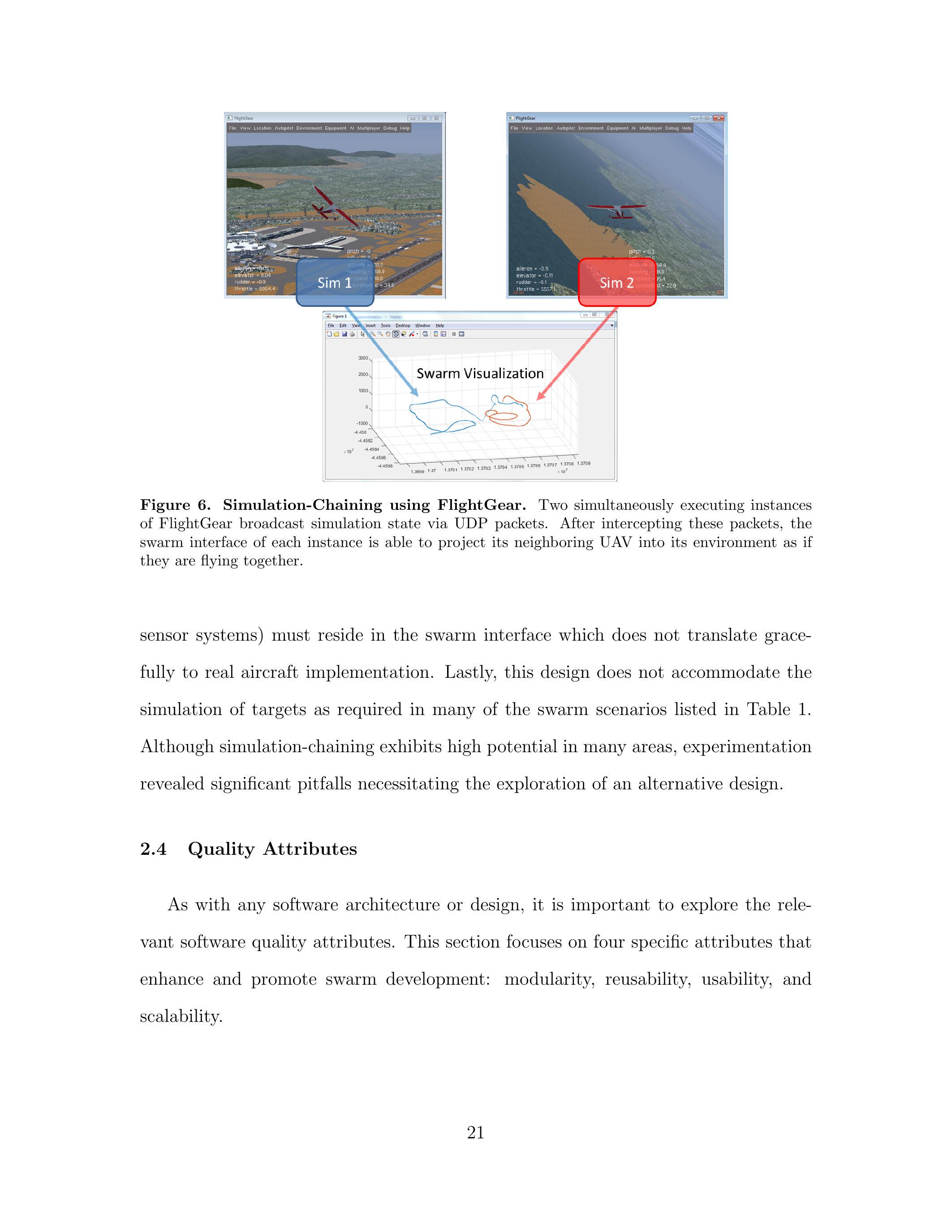 图6. 使用FlightGear的仿真链。两个同时运行的FlightGear实例通过UDP包广播仿真状态。截获这些包后,各实例蜂群接口可将邻近无人机投射进自身环境,仿佛它们共同飞行。