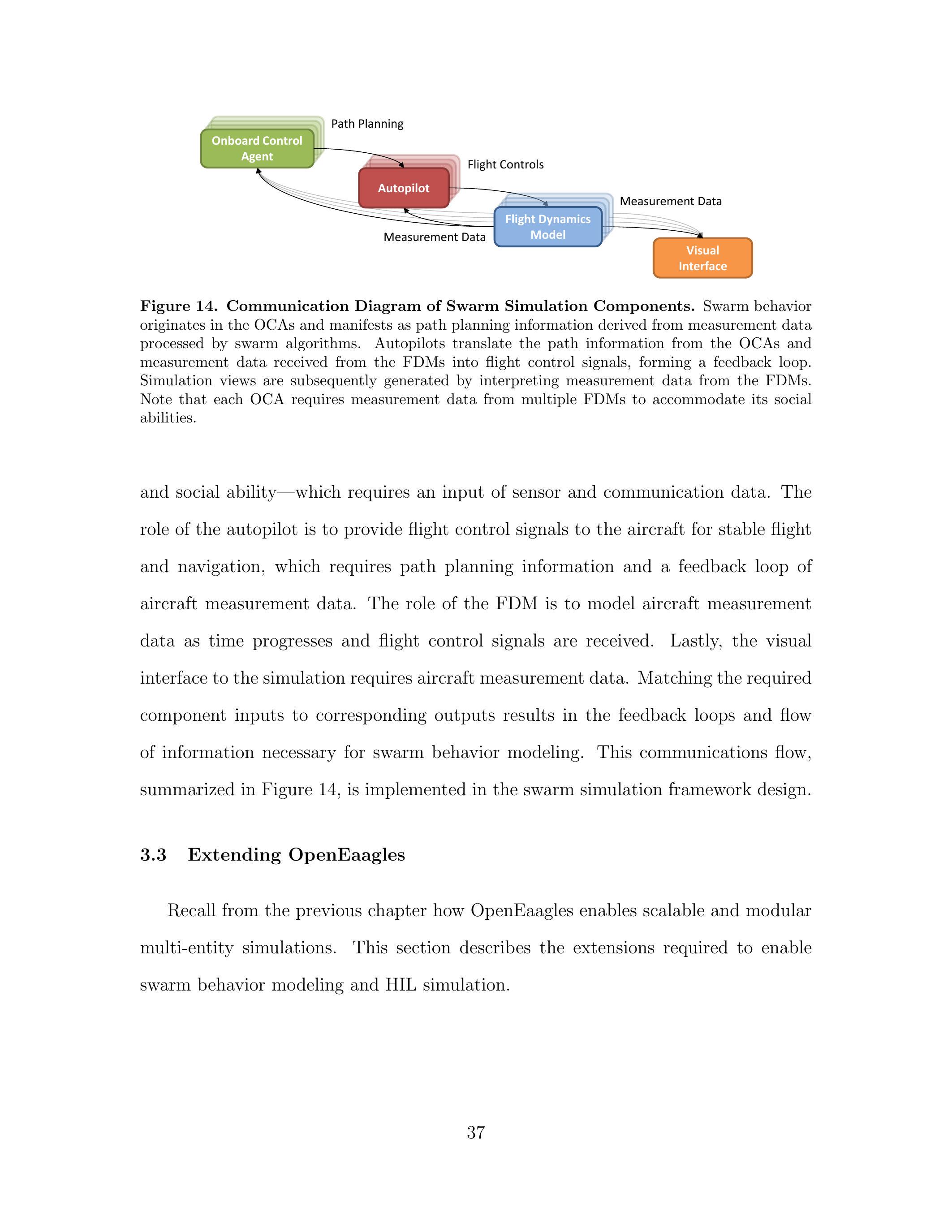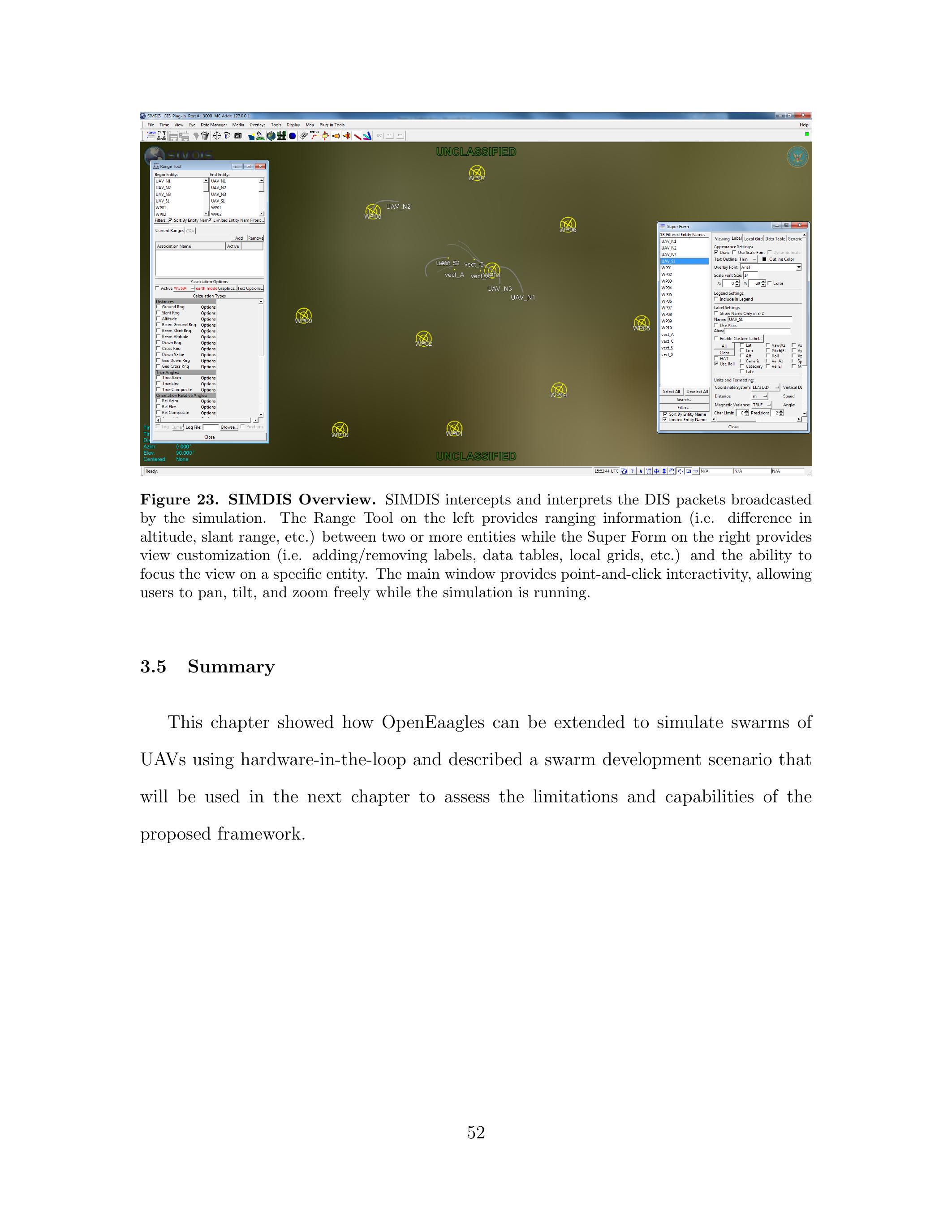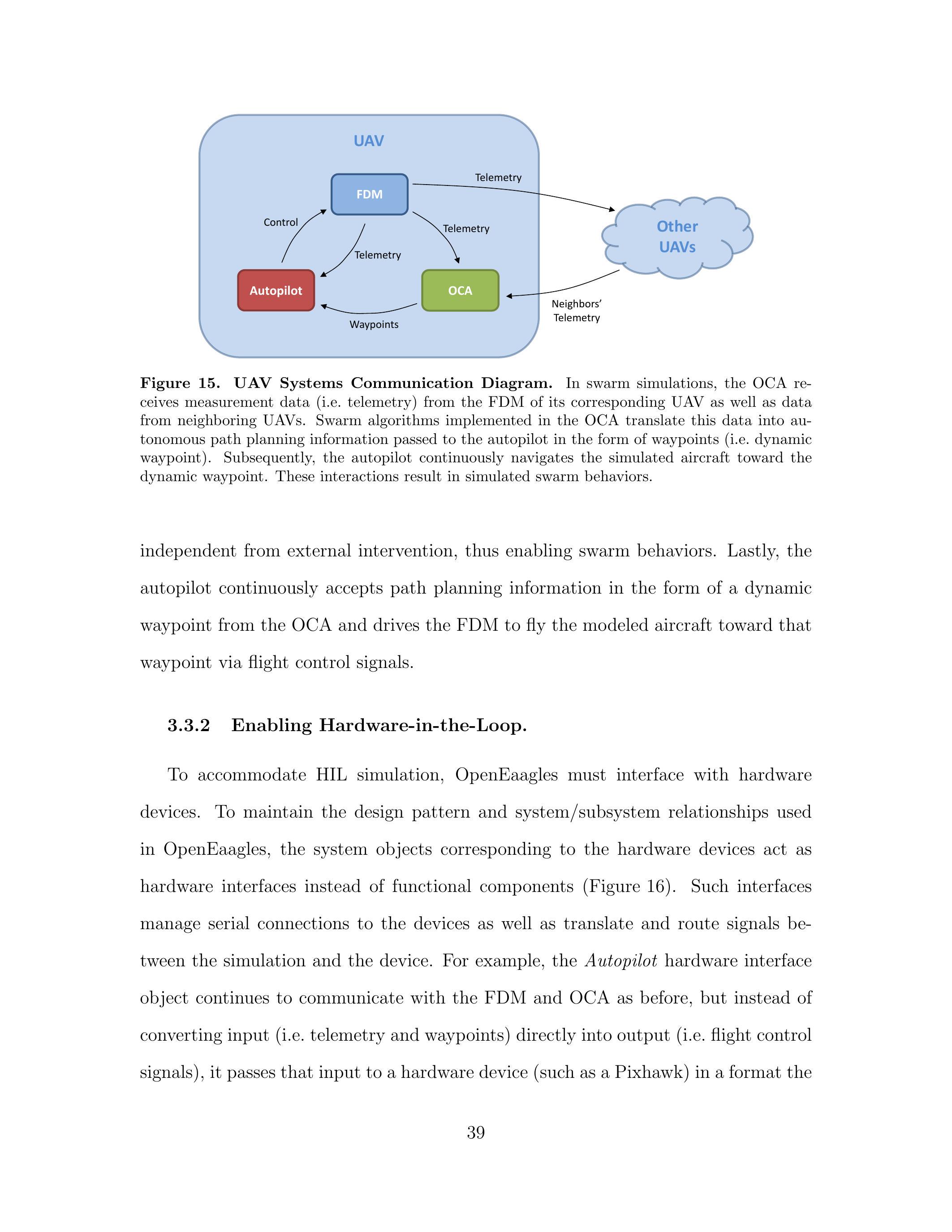 本文提出了对 OpenEaagles 仿真框架的扩展,使其能够在仿真中通过硬件在环(HIL)技术实现可扩展、模块化且逼真的无人机蜂群的测试与开发。OpenEaagles 的仿真树结构促进了蜂群组件集成的高模块化与可扩展性。如第四章所示,机载控制代理(OCA)配合动态航点跟踪(DWF)促进了蜂群开发的封装,实现了一个“沙箱”,使开发者能够先在此环境中实现和测试蜂群算法及控制策略,随后将其应用于真实飞行。此外,JSBSim 这一已经集成于 OpenEaagles 的可信飞行动力学模型(FDM)为蜂群或无人机行为的真实过渡提供了高度信心。