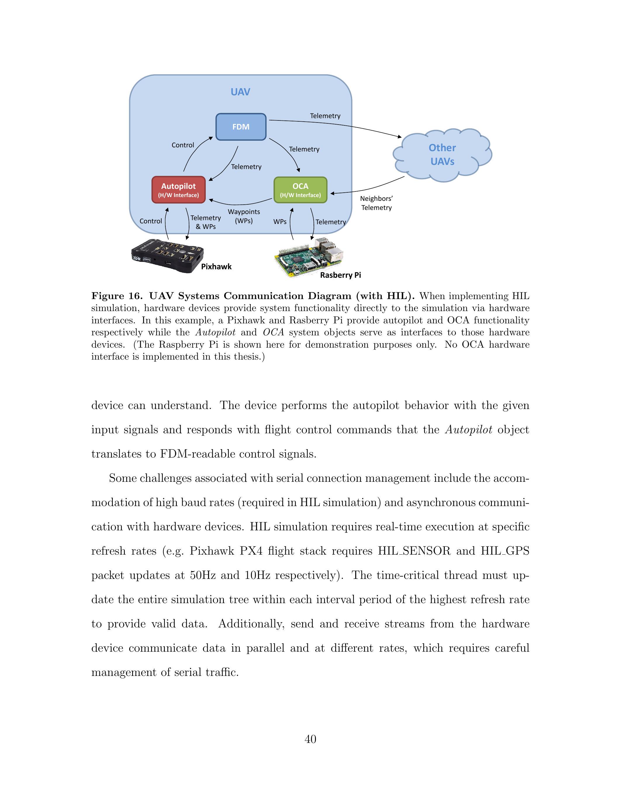 此外,所谓的硬件在环(HIL)技术通过引入控制实际无人机的硬件嵌入式系统,增强了仿真。具体来说,仿真向硬件自动驾驶仪提供传感器信息(如位置、姿态、速度),以换取自动驾驶仪返回的控制信息(即操纵杆、方向舵、油门)。HIL仿真消除了对自动驾驶仪性能假设的需求,迫使仿真考虑通信协议、固件实现、处理器速度限制和集成到自动驾驶仪中的机载应用相关的时序和带宽约束。引入实际用于真实飞行的硬件设备,提高了蜂群在实飞测试中行为与仿真模型一致的信心。因此,本文探讨的蜂群仿真框架构建时即考虑了HIL的适配。