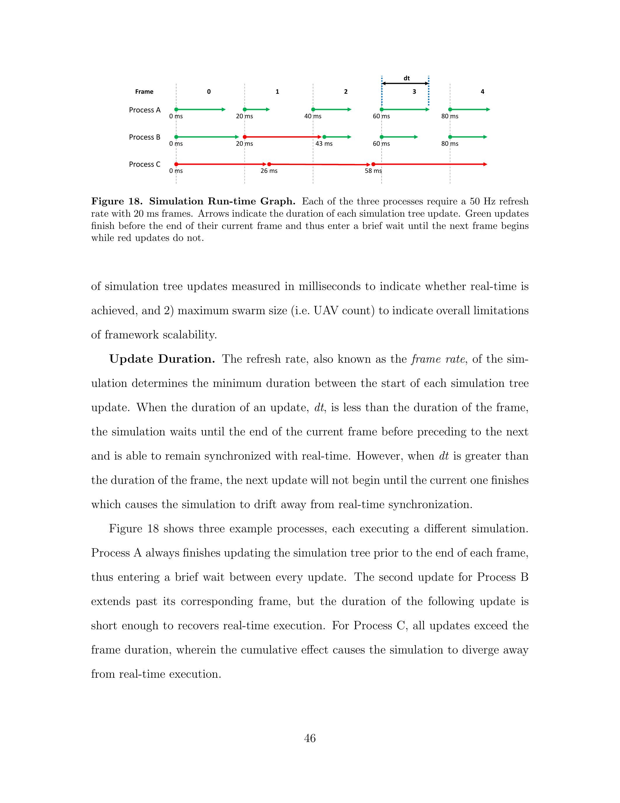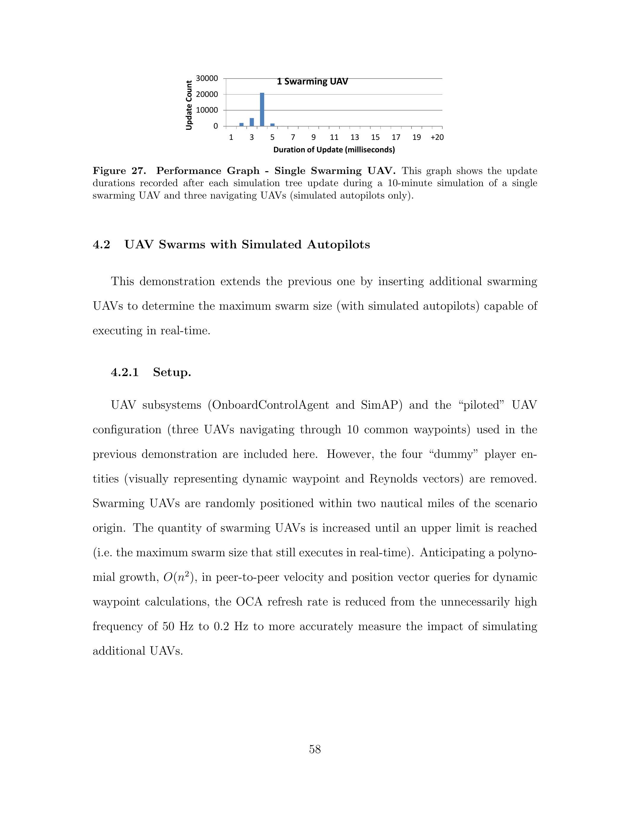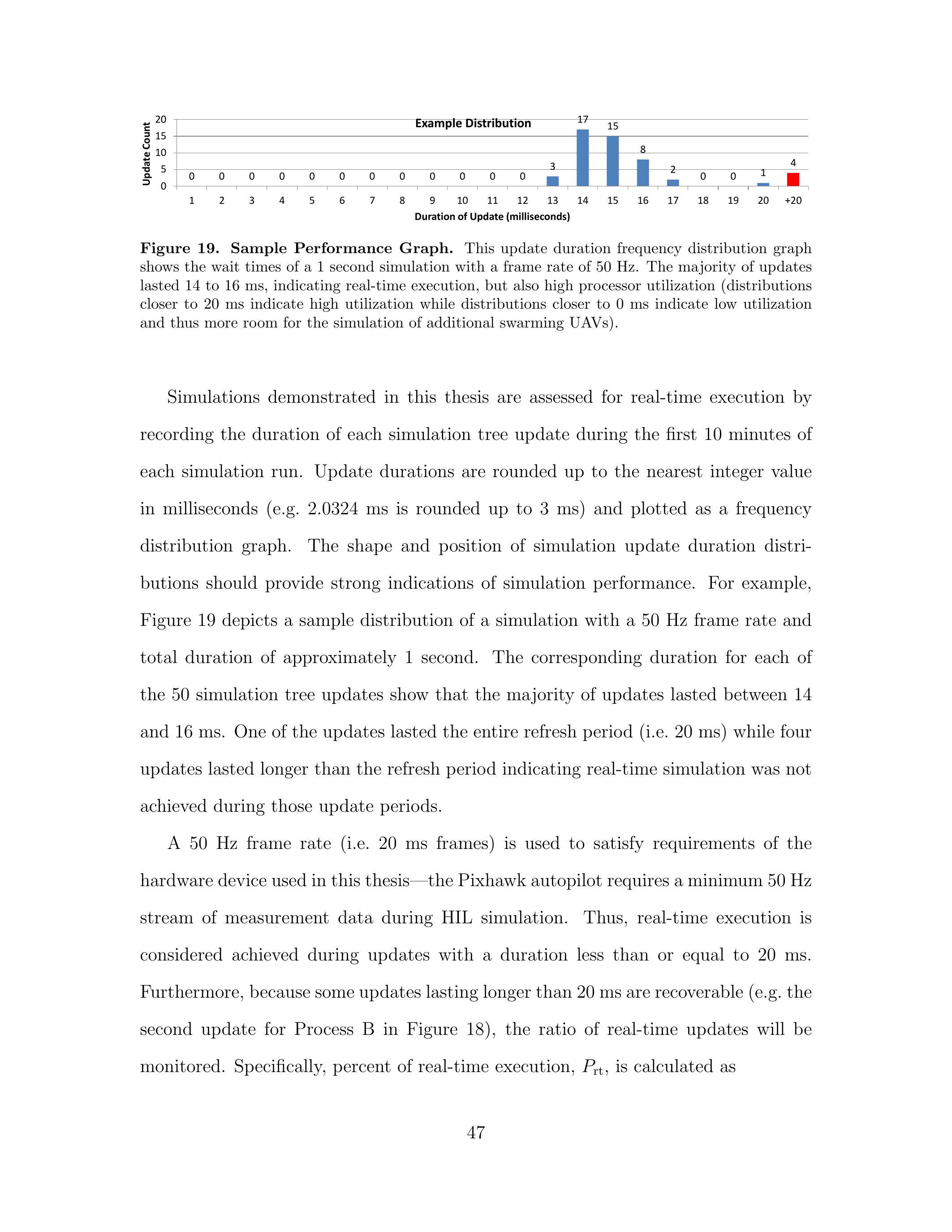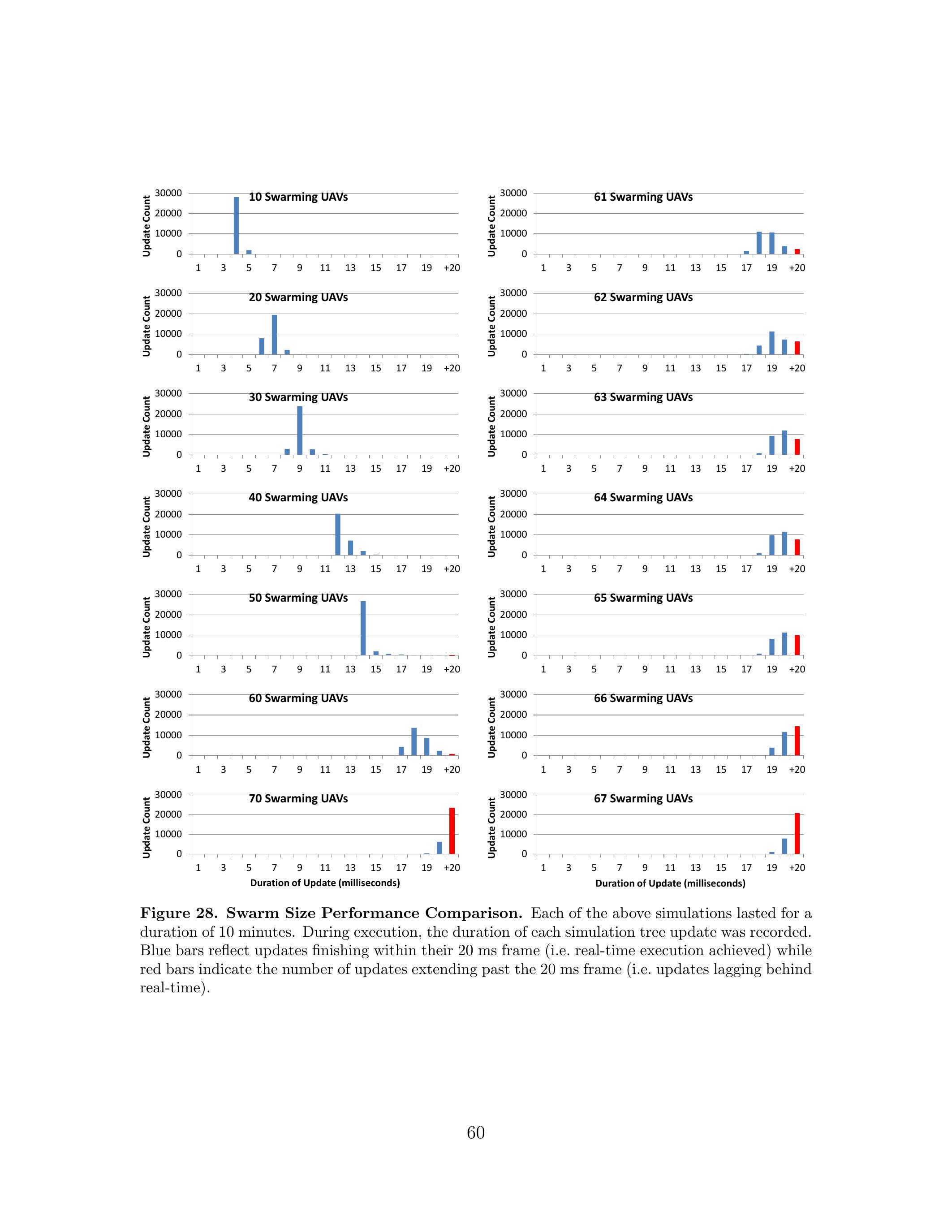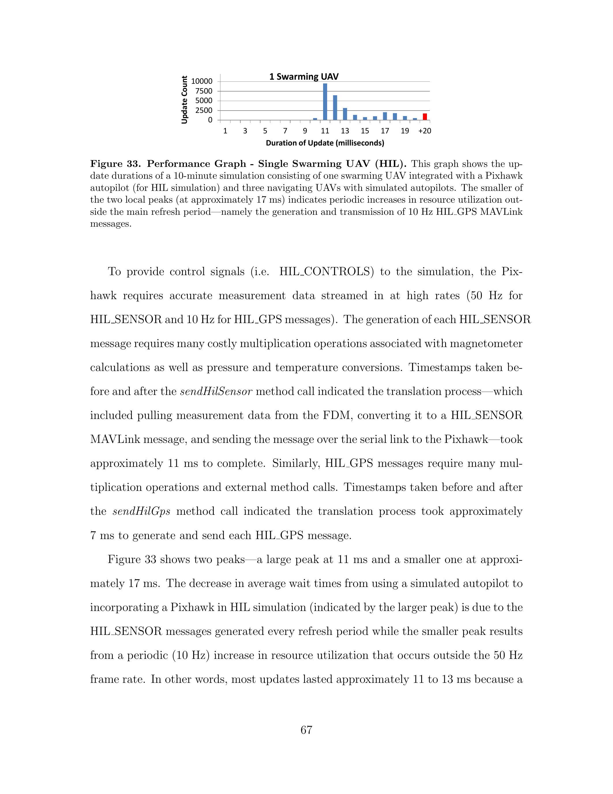 性能分析。更新时长分析显示 HIL 仿真保持了实时执行(图33)。然而,单个由 Pixhawk 自动驾驶仪驱动的蜂群无人机仿真,其更新时长平均值与由模拟自动驾驶仪驱动的 38 架蜂群无人机相当,表明切换至 HIL 仿真时可扩展性大幅降低,主要原因是生成和发送 HIL_SENSOR 与 HIL_GPS 消息时,仿真到 MAVLink 数据转换的高频率开销。