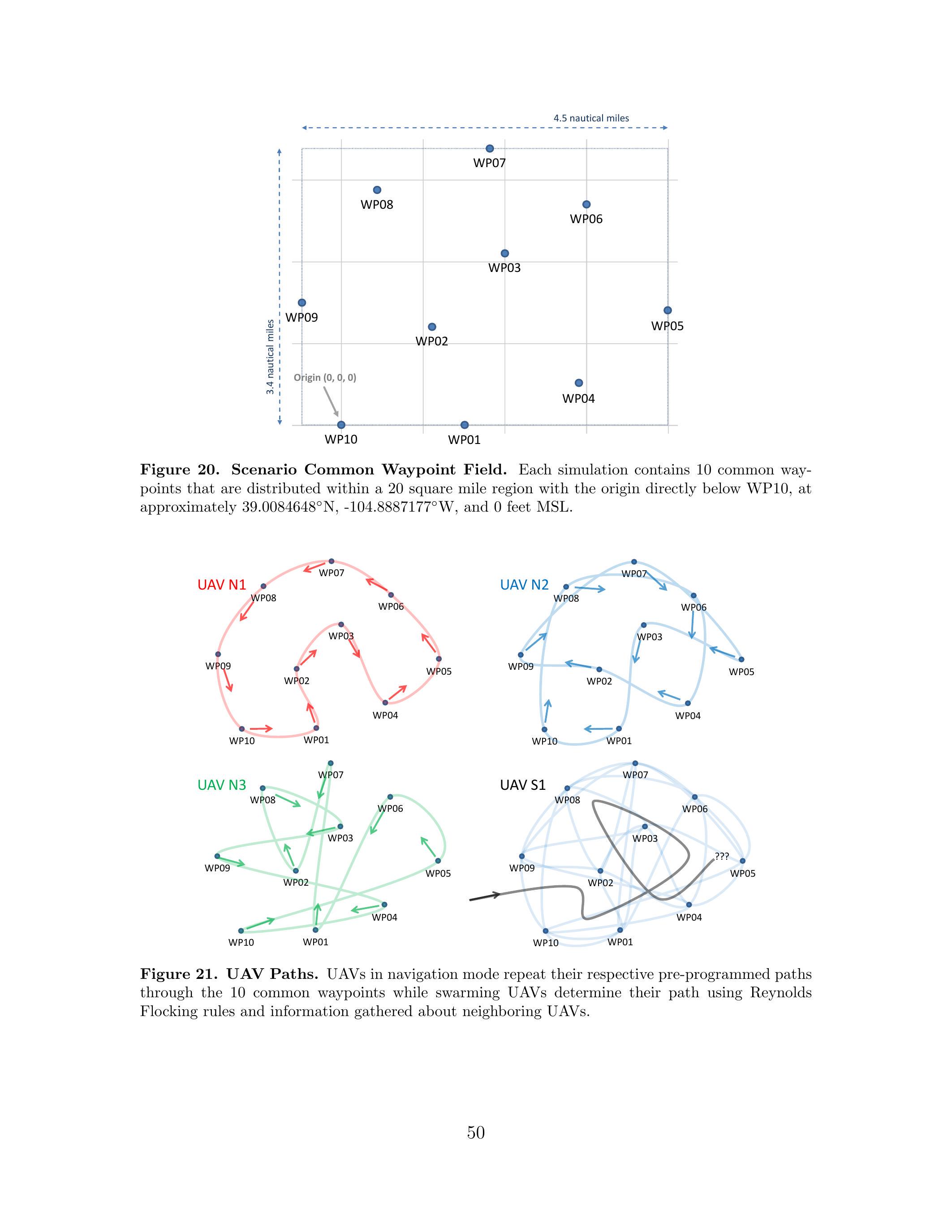 行为表现。不同规模的蜂群行为与仅使用模拟自动驾驶仪时相似。无人机合并形成紧凑编队,在共同航点区内于三架导航无人机附近盘旋。图37 展示了不同蜂群规模下的协调行为。尽管最大可接受实时率的蜂群规模仅为四架,五架和六架蜂群亦表现出稳定的 Reynolds 编队行为。