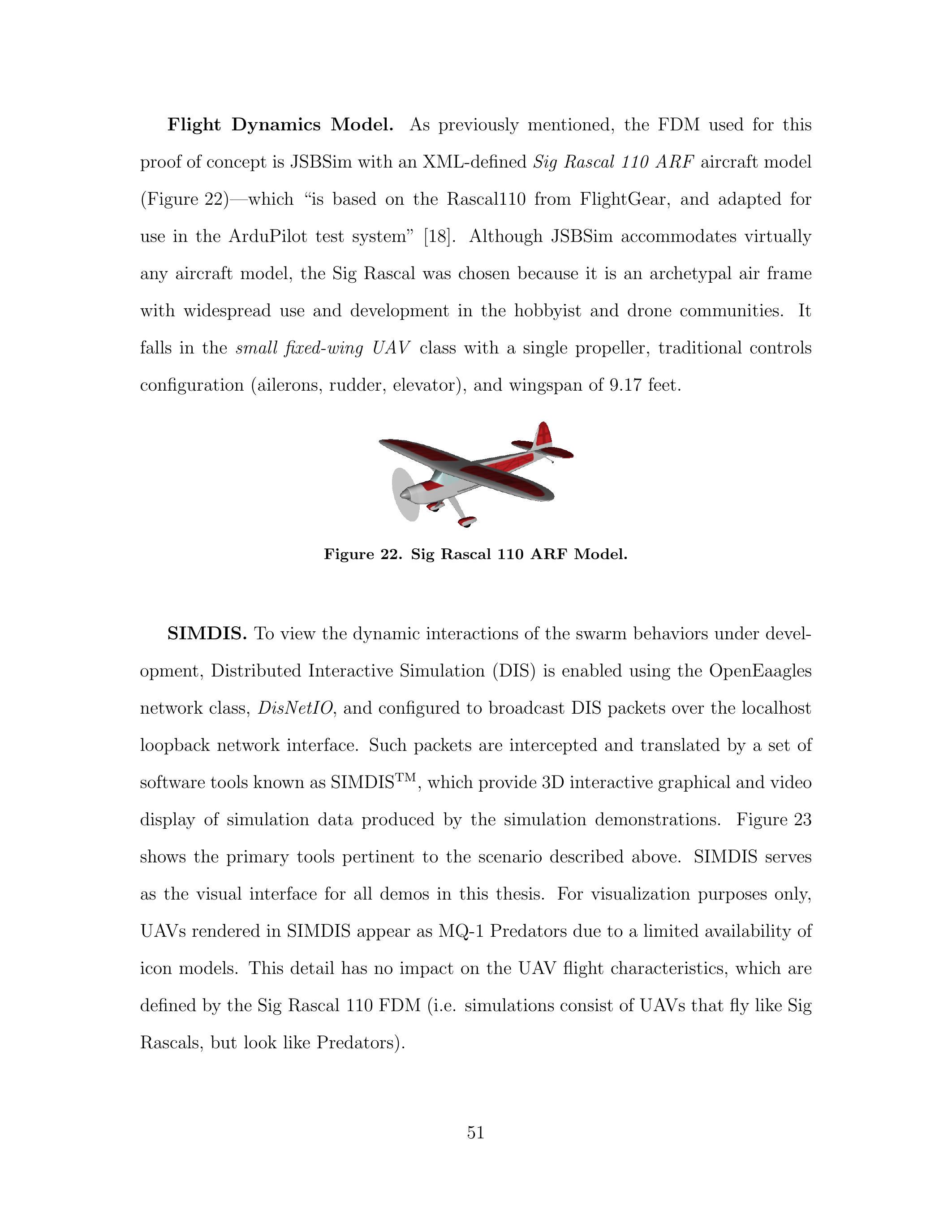机体。 表2展示了用于蜂群开发的一部分飞机样本。然而,业余爱好者社区和美国国防部中存在众多不同尺寸和配置的机体,均有潜力集成至无人机蜂群(见图3)。仿真此类无人机的一大挑战是实现精确的飞行动力学模型(FDM)。本文使用的FDM是开源的JSBSim软件库,该库也是FlightGear的飞行动力学模型,自1996年以来由航天及软件工程专业人士持续开发[5],依赖飞机构型定义文件提供有效的飞行特性数据。Sig Rascal 110飞机模型在业余爱好者社区广泛使用和开发近4年,是本文用于演示所提蜂群仿真框架的机体。