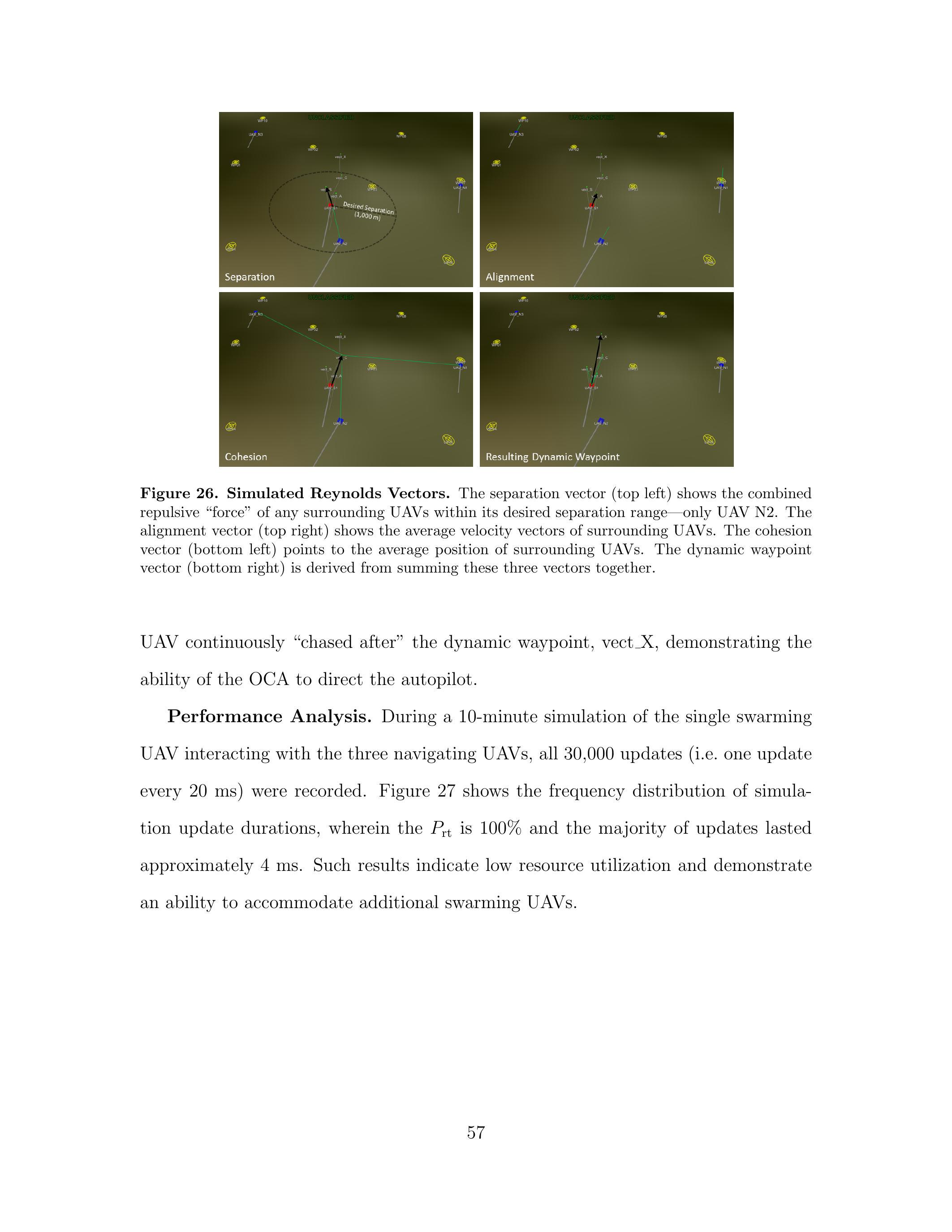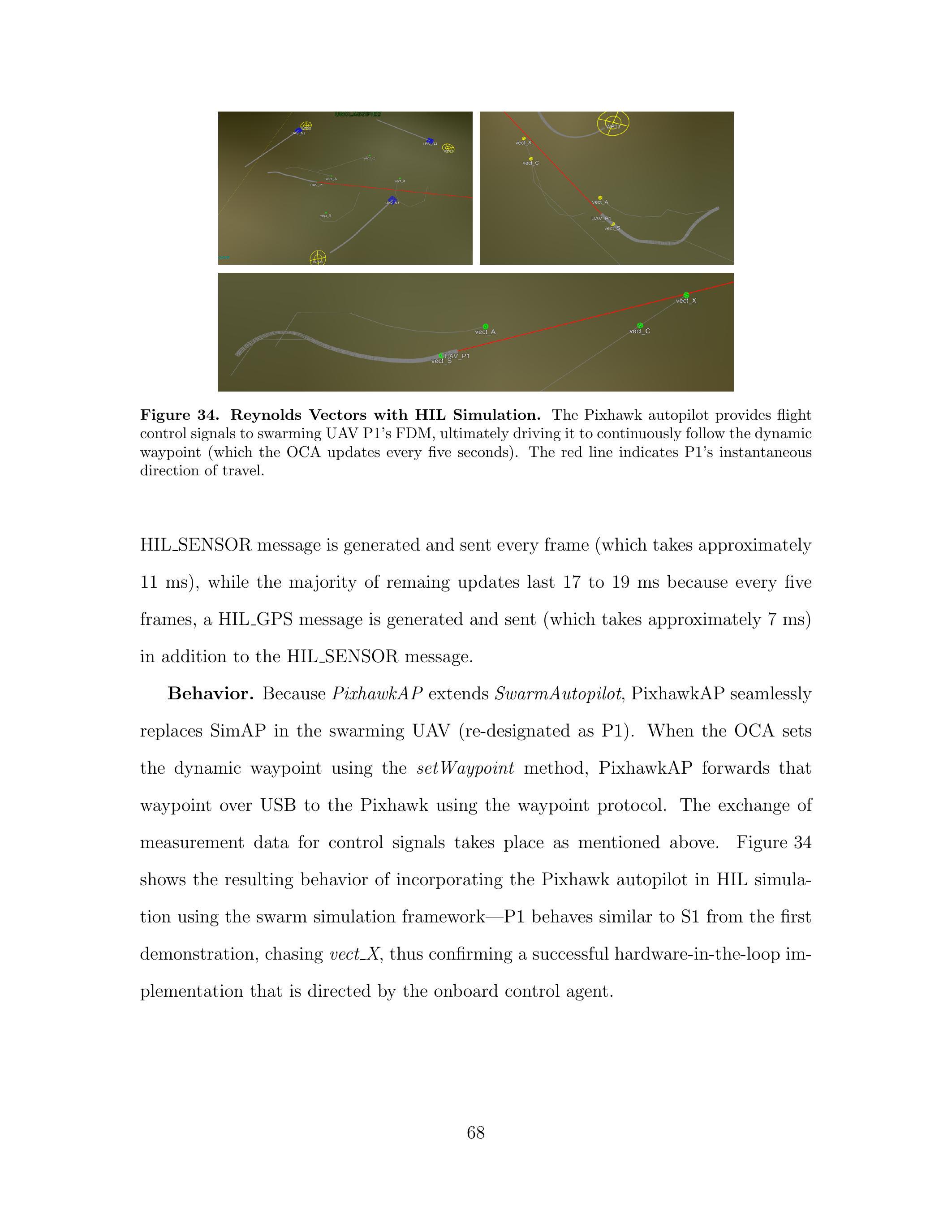 图34. HIL 仿真中的 Reynolds 向量。Pixhawk 自动驾驶仪为蜂群无人机 P1 的 FDM 提供飞控信号,驱动其持续追踪动态航点(由 OCA 每五秒更新一次)。红线表示 P1 的瞬时航向。