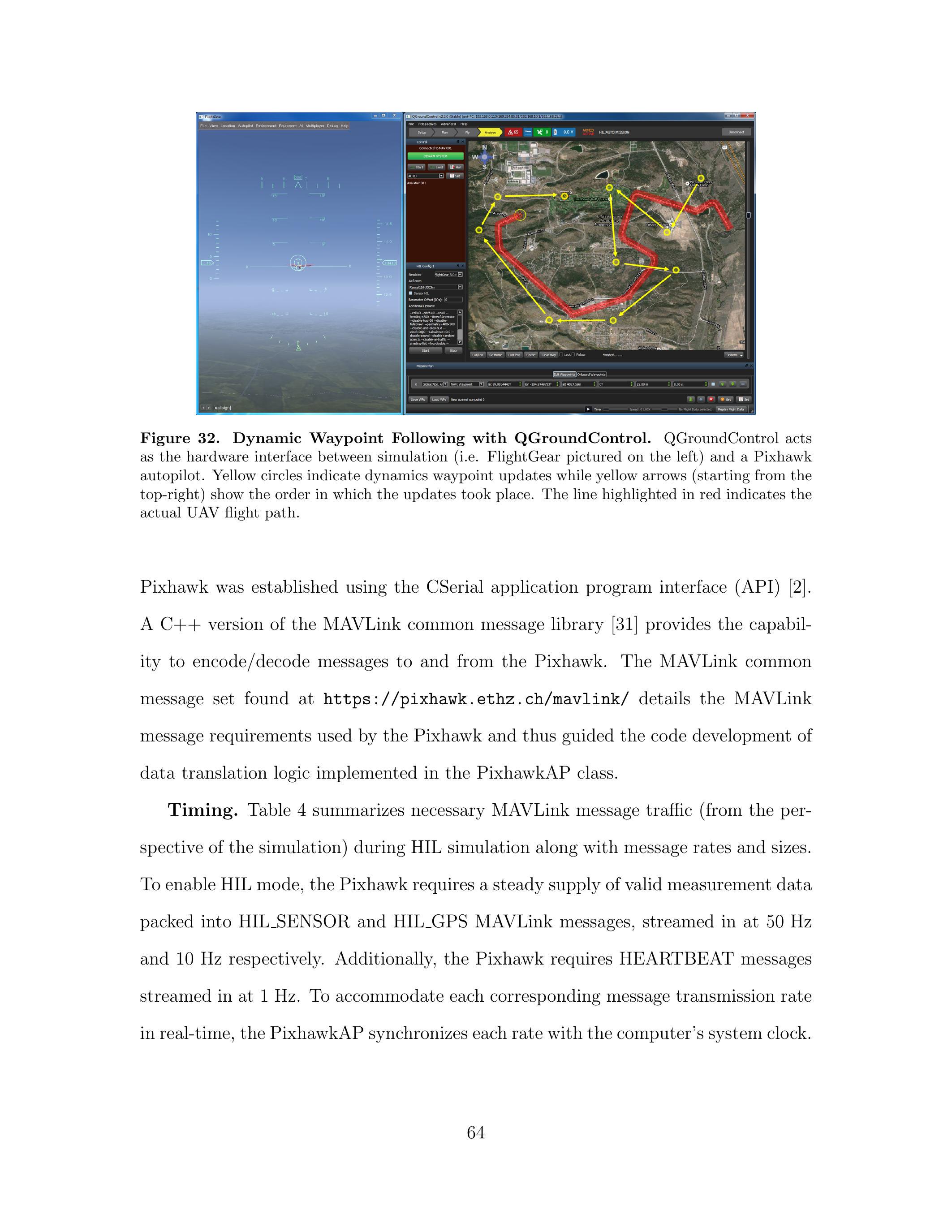 地面控制站。 地面控制站(GCS)为人工操作者提供控制空中或太空无人载具的界面。传统上,GCS在无人机操作中(尤其是业余社区)负责更新自动驾驶仪参数和航点,同时显示无人机遥测数据[16]。如前所述,业余社区使用的GCS软件,如QGroundControl和Mission Planner,也作为HIL接口使用。FlightGear(飞行模拟器)和QGroundControl均为开源软件,本研究利用它们测试和开发与Pixhawk自动驾驶仪的硬件接口,用于蜂群仿真框架中的HIL仿真。