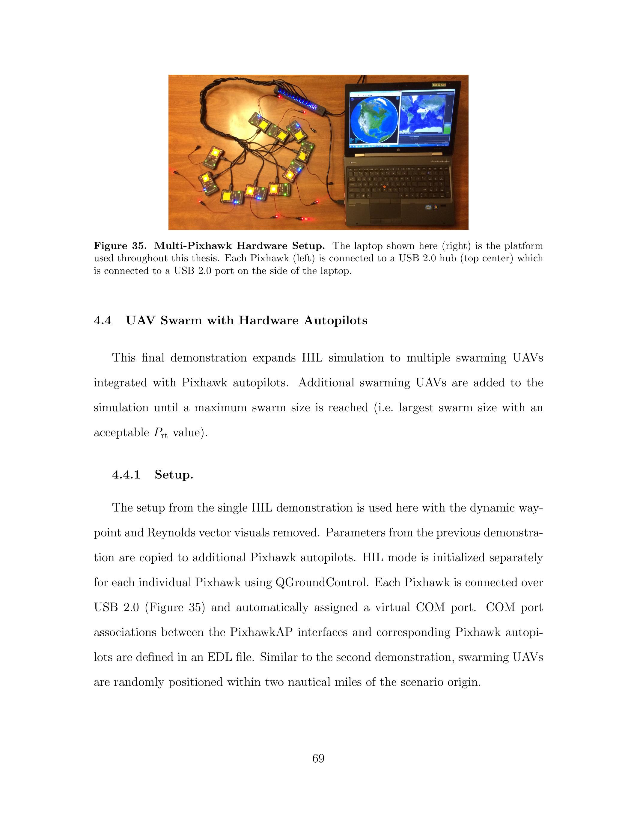 图35. 多 Pixhawk 硬件设置。图中笔记本电脑(右侧)为本论文全部实验的平台。多个 Pixhawk(左侧)通过 USB 2.0 集线器(中央上方)连接到笔记本电脑的 USB 2.0 端口。