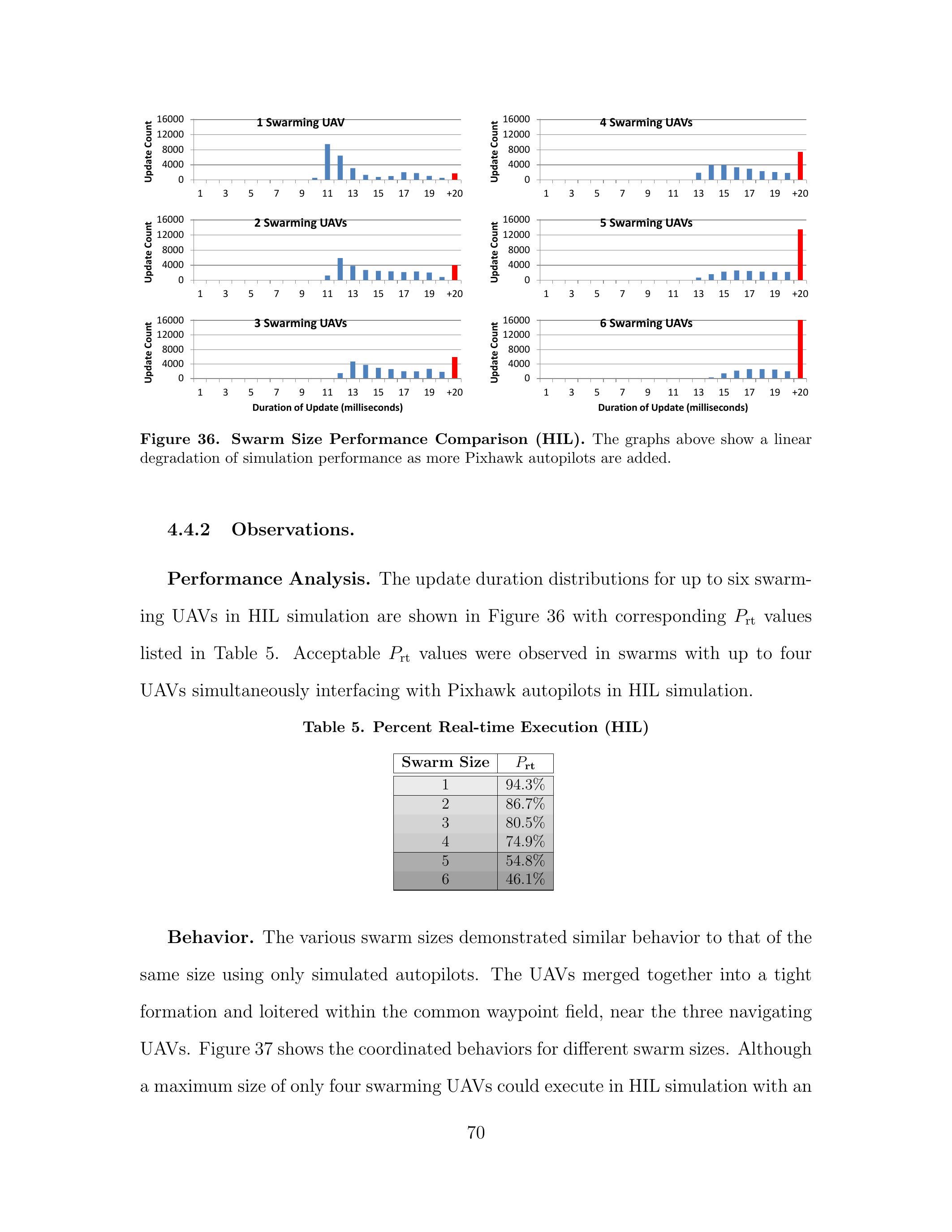性能分析。图36 显示最多六架蜂群无人机参与 HIL 仿真时的更新时长分布,表5 列出相应的 \(P_{\mathrm{rt}}\) 值。最多四架蜂群无人机同时与 Pixhawk 自动驾驶仪接口时,实时执行率处于可接受区间。