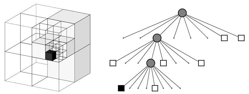 图2 八叉树示例,存储空闲(白色阴影)和占用(黑色)单元格。左侧显示体积模型,右侧显示相应的树形表示。