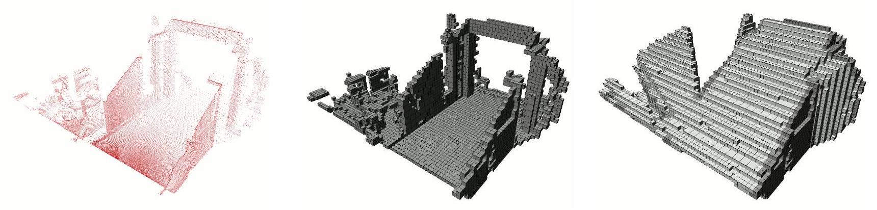 图1 用激光范围传感器扫描的树木的三维表示(从左到右):点云、升高图、多级表面图,以及我们的体积(体素)表示。请注意,我们的体积表示显式地建模了空闲空间,但为了清晰起见,仅显示了占用的体积。
