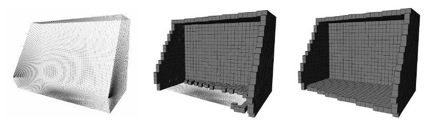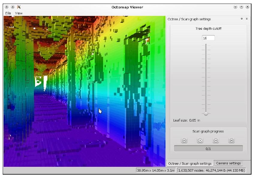 图4 从示例数据生成的八叉树地图。左:在走廊中使用倾斜激光测距仪记录的点云。中:从数据生成的八叉树,仅显示占用体素。右:八叉树的可视化,显示占用体素(深色)和空闲体素(白色)。空闲区域是通过清除从传感器原点到每个端点的射线空间得到的。无损修剪导致叶节点的大小不同,主要在右侧的空闲区域中可见。