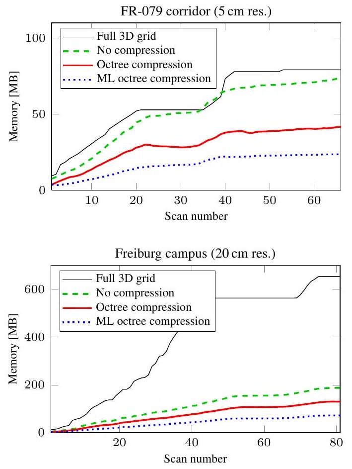 表2显示了序列化二进制最大似然地图(称为“有损”)和完整概率模型(“完整”)的文件大小。需要注意的是,地图文件甚至可以通过使用标准文件压缩方法进一步压缩。即使是相当大的室外数据集(如弗莱堡校园和新学院)的地图,文件大小也小于14MB。