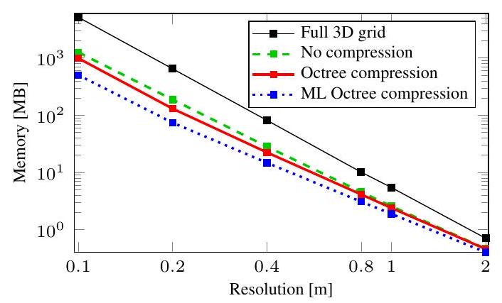 如预期的那样,内存使用量随树分辨率的增加呈指数增长。图15展示了这一效果,其中我们使用对数缩放进行绘图。