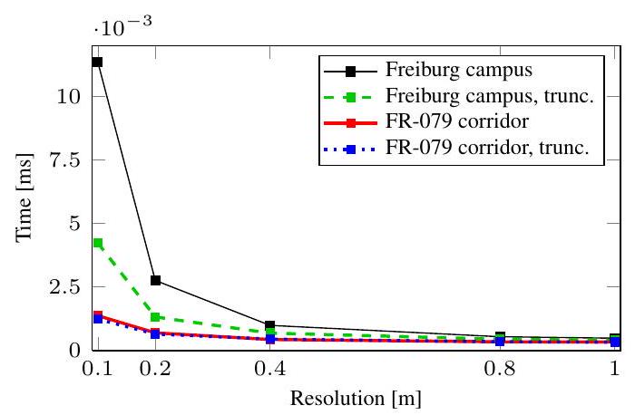图16 更新八叉树地图时插入一个数据点的平均时间,数据集包括弗莱堡校园和FR-079走廊。截断版本只插入最大传感器范围为10米的射线。
