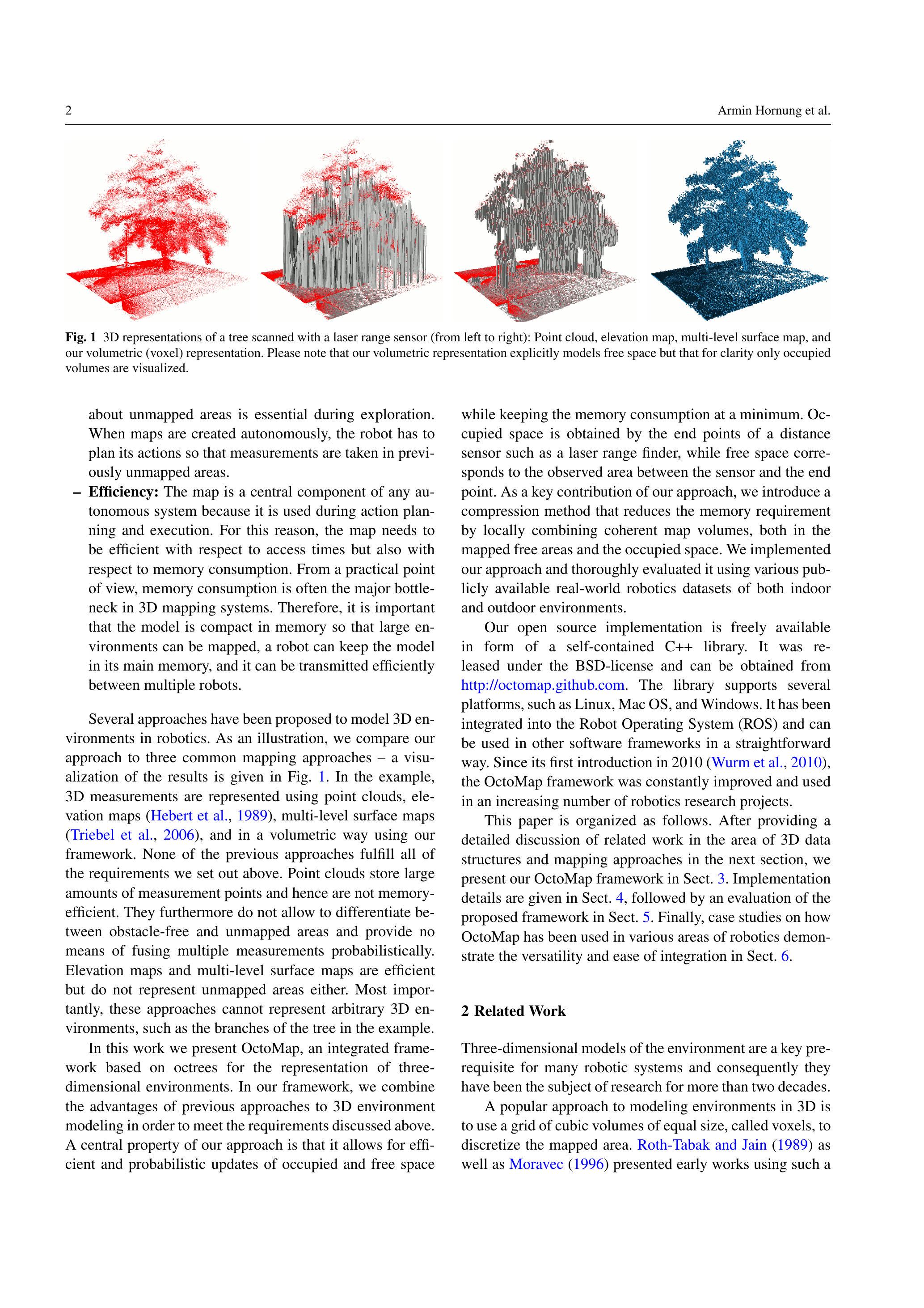 已经提出了几种方法来建模机器人中的三维环境。为了说明这一点,我们将我们的方法与三种常见的建图方法进行比较——结果的可视化如图1所示。在这个例子中,三维测量通过点云、升高图(Hebert等,1989)、多级表面图(Triebel等,2006)以及我们框架中的体积方式进行表示。之前的任何方法都没有满足我们上面列出的所有要求。点云存储大量的测量点,因此在内存效率方面不佳。此外,它们无法区分无障碍和未建图区域,也没有提供以概率方式融合多个测量的手段。升高图和多级表面图效率较高,但也不表示未建图区域。最重要的是,这些方法无法表示任意的三维环境,例如示例中的树枝。