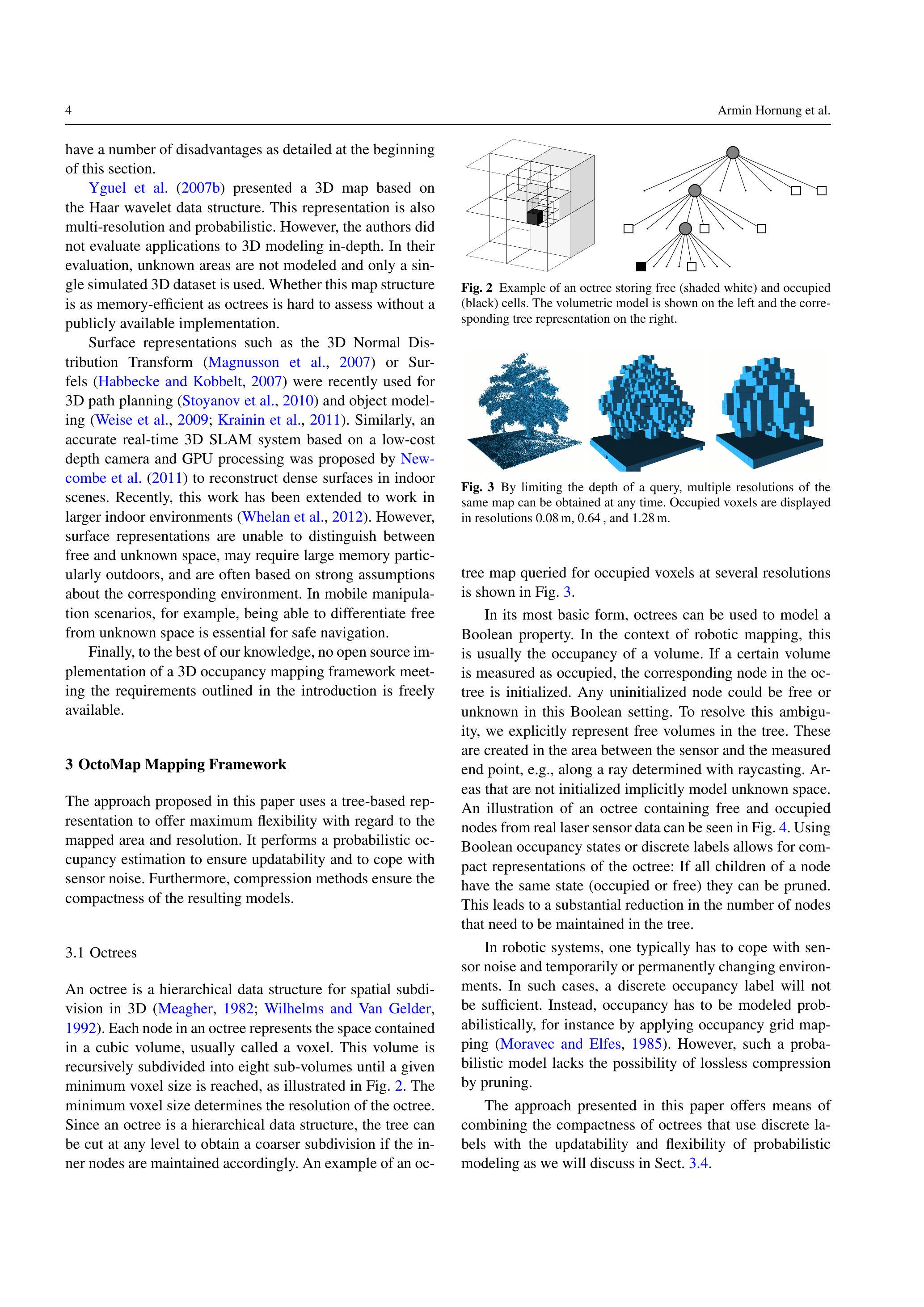 作为一种数据结构,八叉树被应用于多种领域,特别是在计算机图形学中,用于高效渲染(Botsch等,2002;Surmann等,2003;Laine和Karras,2010)以及在摄影测量领域用于存储和处理大型点云(Girardeau-Montaut等,2005;Elseberg等,2011)。另一个流行的应用是静态点云(Schnabel和Klein,2006)或点云流(Kammerl等,2012)的压缩。尽管我们的框架足够通用,也可以存储原始点云,但它的主要目的是将这些点云整合为一种内存高效的体积占用地图,因为点云作为机器人环境表示存在许多缺点,这在本节开头已经详细讨论过。