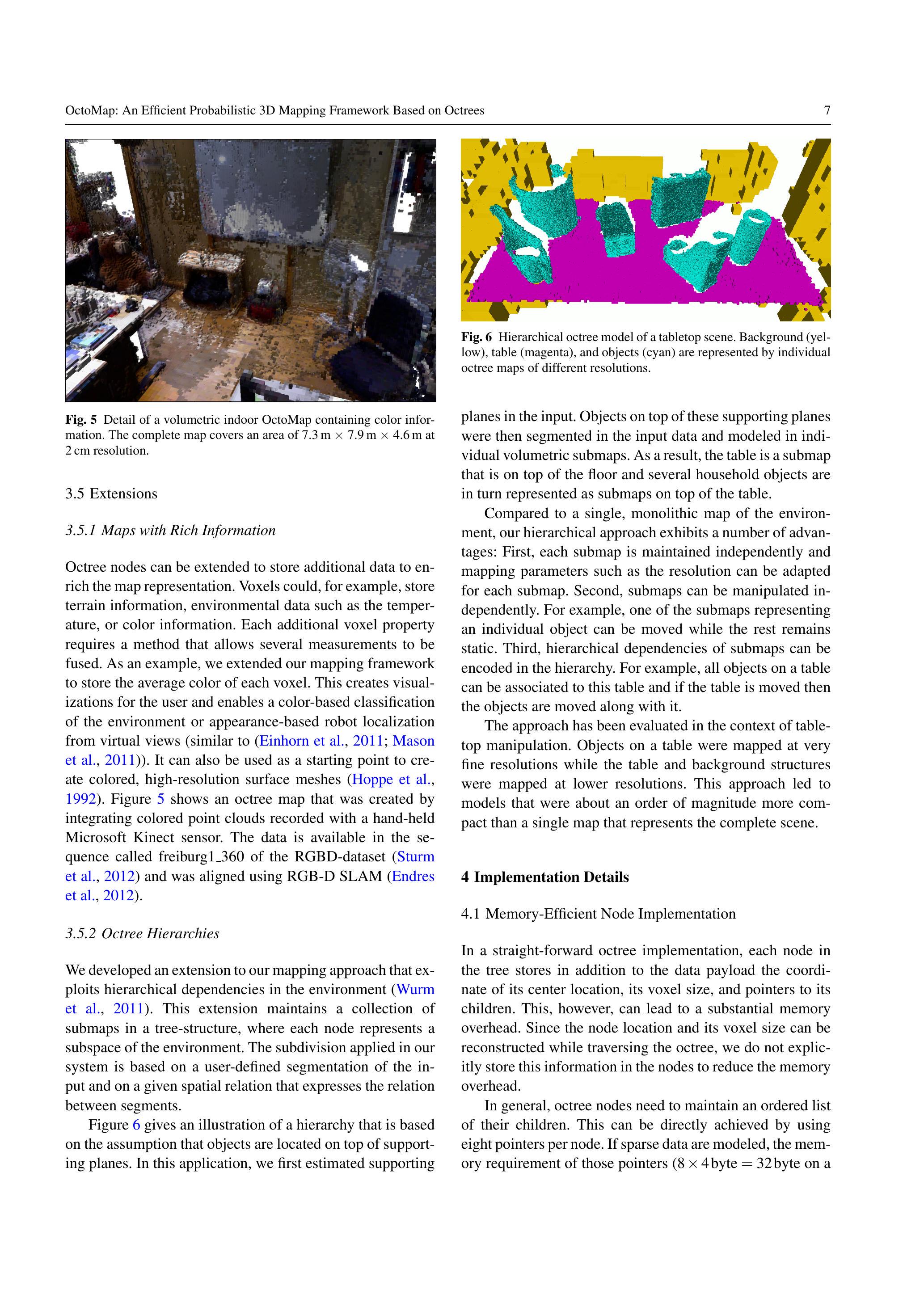 表2:不同八叉树压缩类型与完整3D占用地图(称为3D网格)在32位架构上的内存消耗比较。八叉树内存压缩是通过将相同的子节点合并到父节点中实现的(称为修剪)。通过将每个节点转换为其最大似然值(完全空闲或占用),并随后修剪整个树,可以实现更高效但更有损的内存压缩。然后,可以将仅包含空闲和占用节点的最大似然树序列化为紧凑的二进制文件格式(称为有损文件)。(*): 体素包含来自RGBD数据集的完整颜色信息。