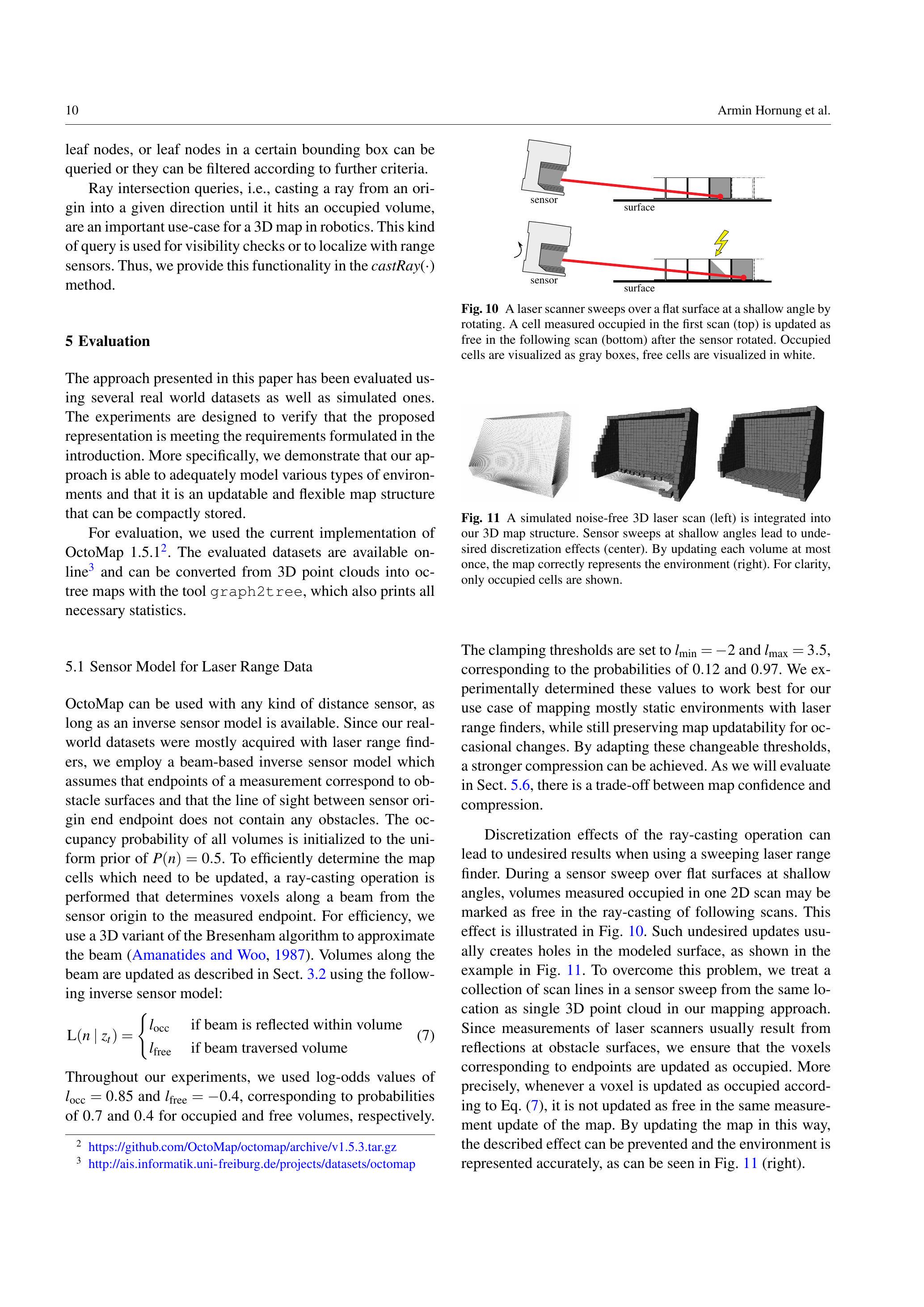 在我们的方法中,传感器读数是通过占用网格建图进行整合的,这一方法由Moravec和Elfes(1985)提出。给定传感器测量值\(z_{1:t}\),叶节点\(n\)被占用的概率\(P\left(n \mid z_{1: t}\right)\)是根据以下公式估计的: