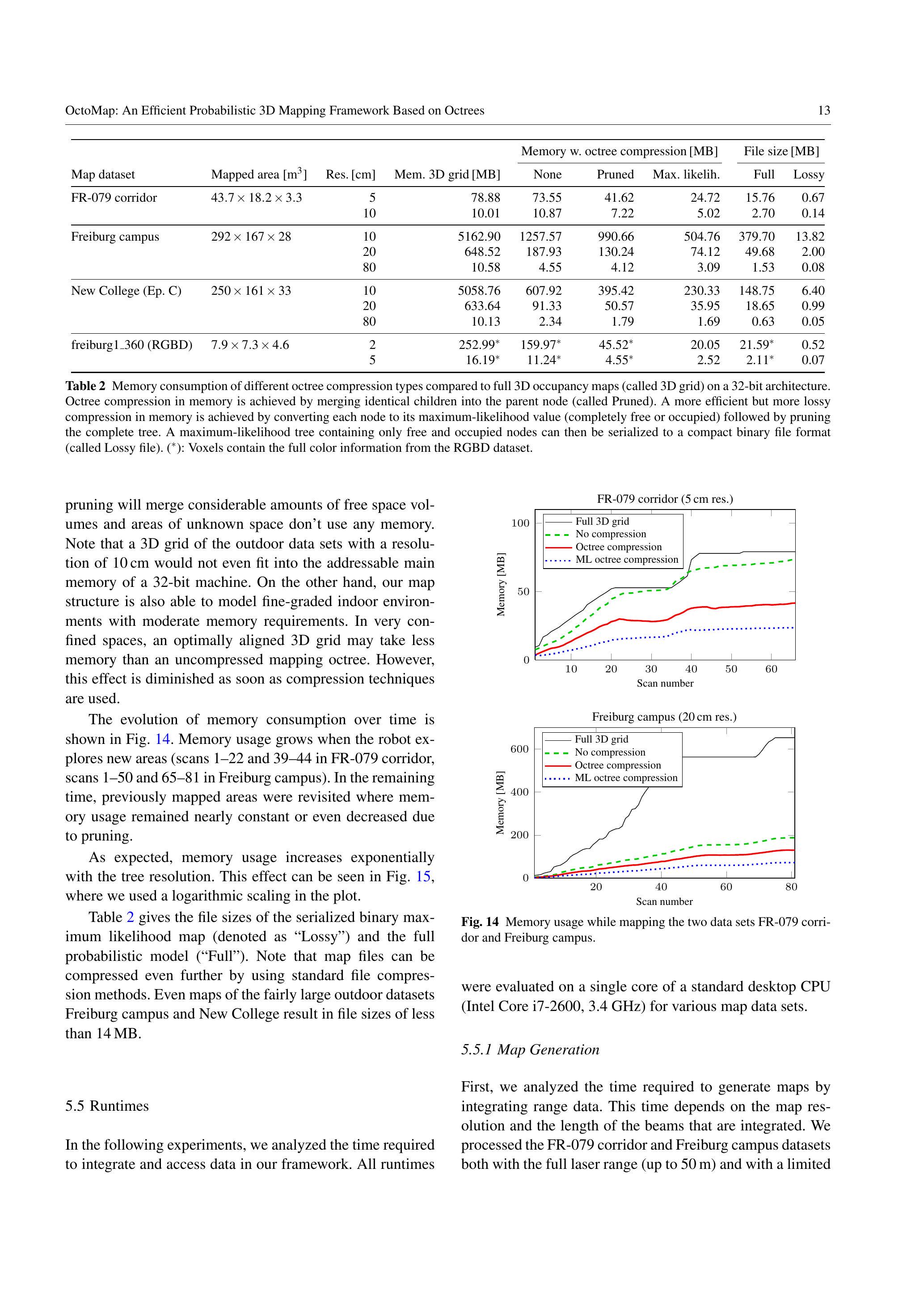 表2显示了序列化二进制最大似然地图(称为“有损”)和完整概率模型(“完整”)的文件大小。需要注意的是,地图文件甚至可以通过使用标准文件压缩方法进一步压缩。即使是相当大的室外数据集(如弗莱堡校园和新学院)的地图,文件大小也小于14MB。