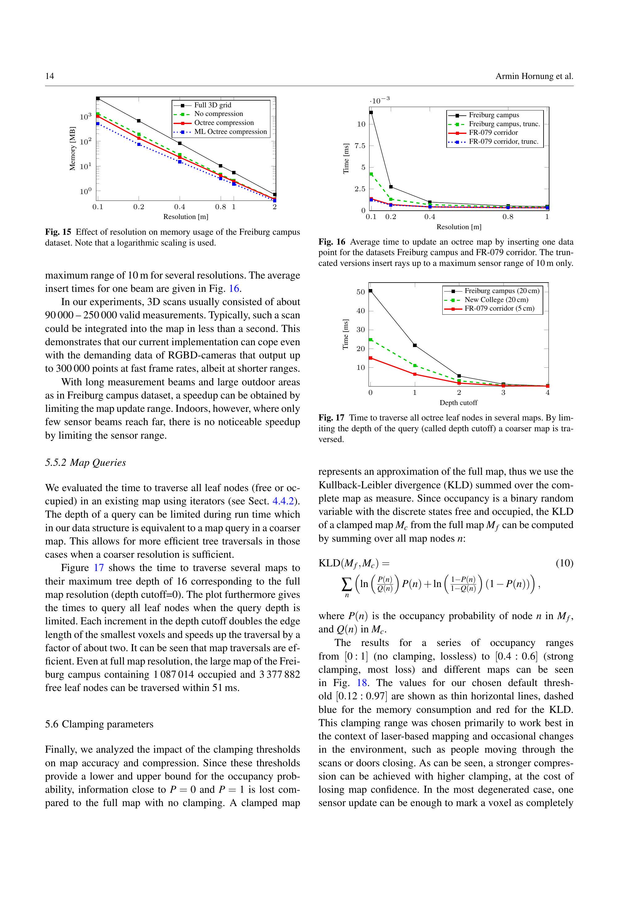 在我们的实验中,3D扫描通常包含约\(90000-250000\)个有效测量。通常,这样的扫描可以在不到一秒的时间内集成到地图中。这表明我们当前的实现即使面对RGBD相机的高数据量(这些相机以快速帧率输出最多300000个点)也能处理得很好,尽管测量范围较短。
