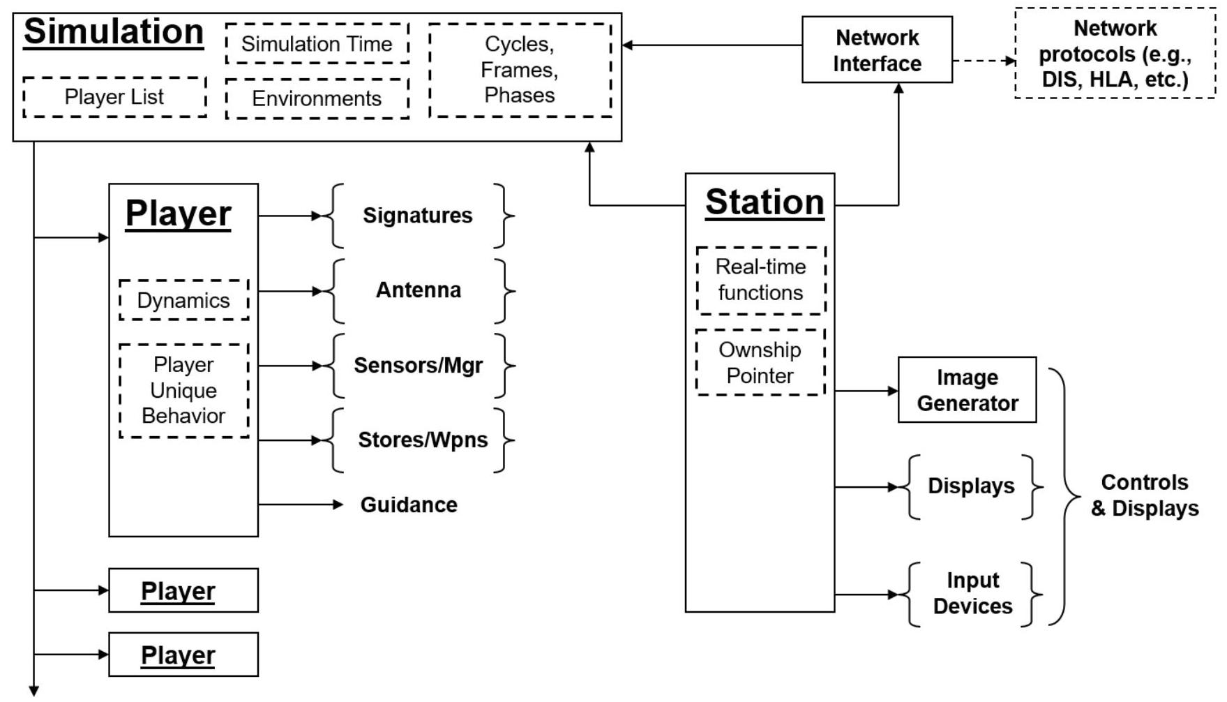 Station 连接模型与视图(如图形显示、I/O 设备和控制、互操作网络)。Station 拥有一个 Simulation 实例,管理玩家列表(即实体或平台),并跟踪仿真时间,包括当前处理的周期、帧和阶段。