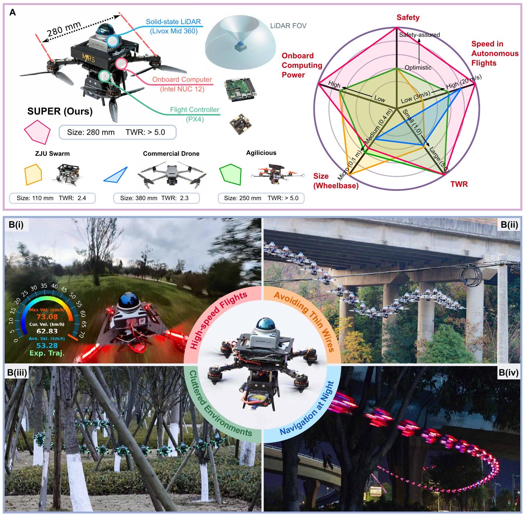 图1. 所提自主空中系统概览。(A) 雷达图展示SUPER与其他先进自主空中机器人对比,包括掌上型自主MAV(ZJU Swarm)(35)、开源灵巧四旋翼平台(Agilicious)(33)以及代表性商用无人机(27)。Agilicious数据取自文献(16)中其机载自主飞行的最佳表现。商用无人机的尺寸、推重比及APAS允许的最大飞行速度来自厂商官网(27)。机载计算能力和安全策略未公开,故未展示。(B) SUPER在真实飞行中的演示。(i) 野外高速飞行;(ii) 避开细电线;(iii) 穿越杂乱环境;(iv) 夜间飞行。