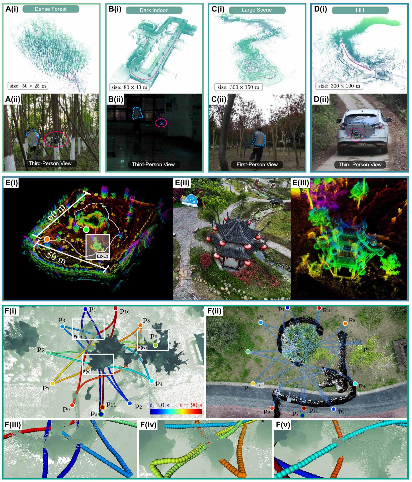 图2. SUPER的附加应用。目标跟踪示例,包括(A) 在密林中跟踪奔跑的人,(B) 黑暗室内场景,(C) 大型场景,(D) 在丘陵村庄道路上行驶的汽车。(A)(i) 和 (D)(i) 显示基于飞行后在线激光雷达测量合成的点云地图,目标轨迹和MAV轨迹分别以蓝色和红色标示。(A)(ii) 和 (D)(ii) 显示实验中的第三人称或第一人称视角快照。(E) (i) 在50×60平方米区域内的自主探索实验,SUPER执行轨迹以白线示意。(ii) 和 (iii) 分别为场景快照及对应的重建结果。(F) 航点导航示例。(i) MAV从起点 \(\mathbf{p}_{s}\) 出发,依次访问11个航点 \(\mathbf{p}_{1} \sim \mathbf{p}_{11}\),轨迹基于时间编码颜色。(ii) 时序图像合成,展示环境变化和MAV飞行轨迹。黑色伪影由区域内随机移动的两人引起,MAV轨迹以蓝色突出显示。(iii 至 v) 展示MAV在被移动对象经过位置的飞行轨迹,SUPER能够利用移动物体先前穿过的空间。