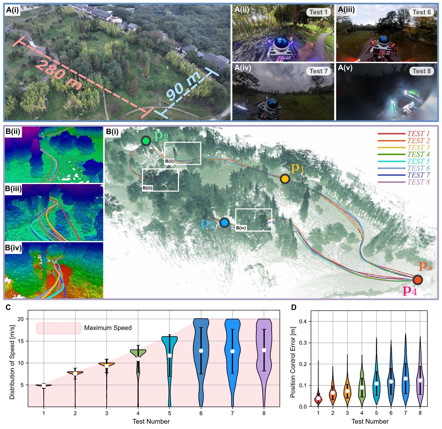 图3. 未知环境中的安全高速导航。(A) 实验环境鸟瞰图。(ii 至 v) 八次实验中的四种典型光照条件,(ii) 为测试1的拍摄图,(iii 至 v) 分别为测试6至8的拍摄图。(B) (i) 八次测试中执行的轨迹以不同颜色曲线表示。所有测试中,MAV依次飞越航点 \(\mathbf{p}_{5}, \mathbf{p}_{1}, \mathbf{p}_{2}, \mathbf{p}_{3}\) 并停于 \(\mathbf{p}_{4}\)。轨迹叠加了飞行中采集点测量线下合成的点云地图。(ii 至 iv) 飞行路径上环境的三处详细视图。(C 和 D) 小提琴图展示八次测试中飞行速度和位置跟踪误差分布。小提琴图形状表示数据密度,白点为均值,黑色误差线为标准差。数据通过均匀采样每次测试2000个飞行数据点获得。
