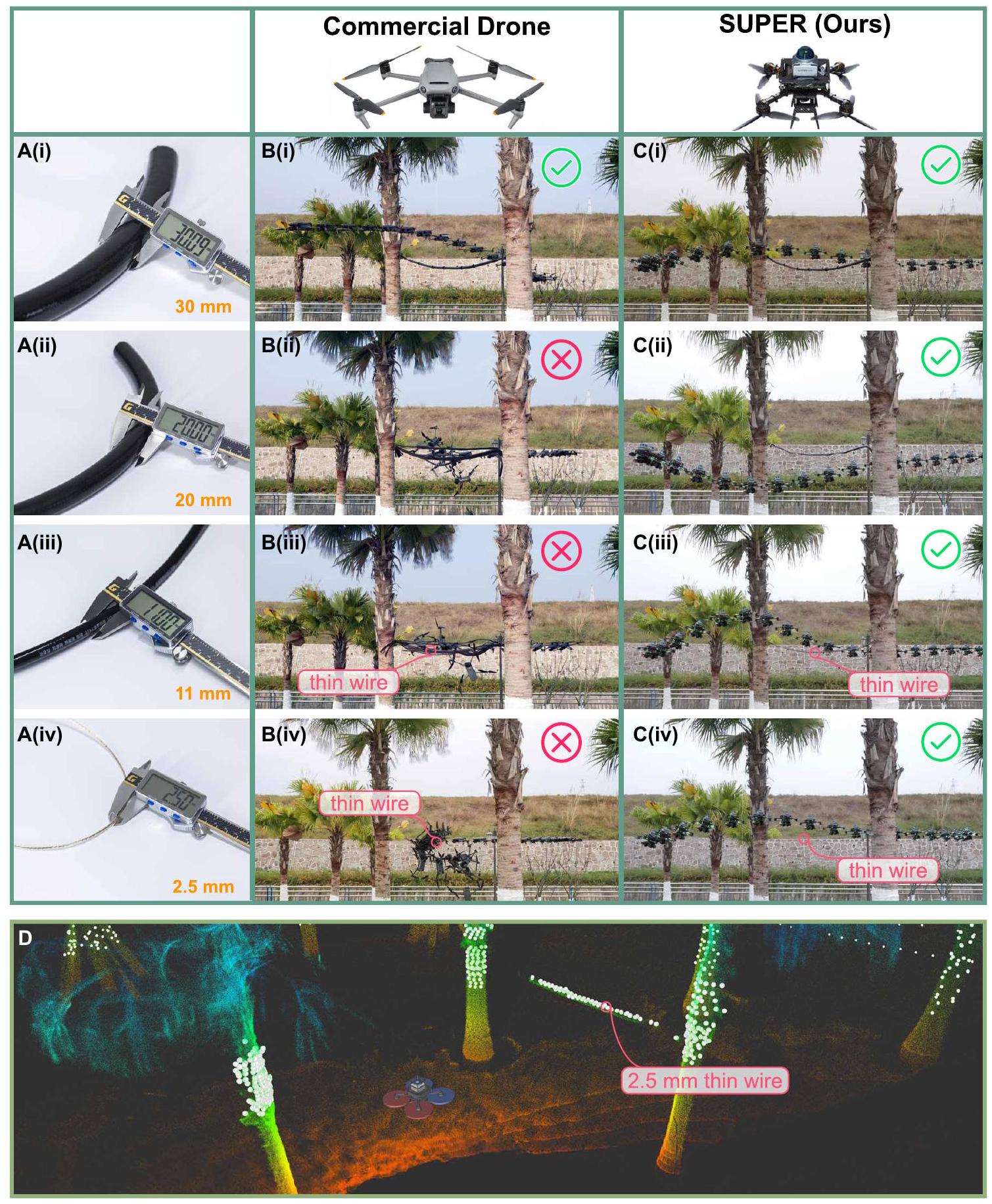 图5. 细小物体规避演示。(A) (i 至 iv) 实验中使用的四根不同直径细线。(B) (i 至 iv) DJI Mavic 3飞行的延时照片。其成功避开直径为30毫米的细线,但未能避开更细细线。碰撞导致细线摆动,延时照片中出现伪影,尽管每次实验仅有一根细线。(C) (i 至 iv) SUPER飞行的延时照片,成功避开所有四种细线。(D) SUPER面对2.5毫米细线时的点云视图。细线在当前扫描测量(白点)中可见,累积点云(彩色点)中更为明显。
