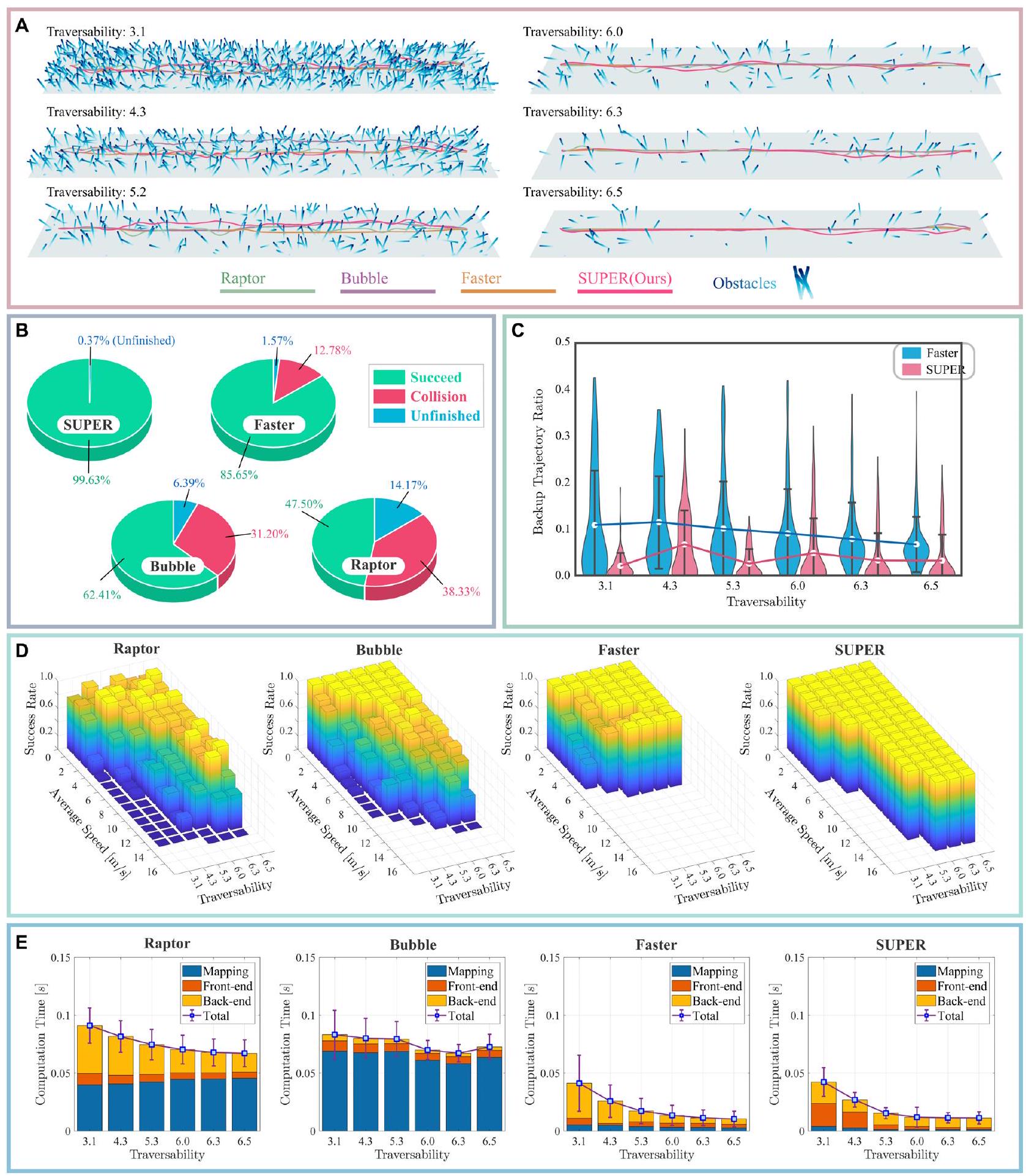 我们通过一系列仿真实验评估了SUPER规划模块的性能。测试环境由一组尺寸固定为110×20米的随机生成类森林三维场景组成(图6A)。场景涵盖六种不同障碍密度,按可通行性(traversability)指标变化范围为3.1至6.5(30)。可通行性为障碍密度相对于机器人尺寸(本模拟中最大半径 \(r=0.2 \mathrm{~m}\))的归一化度量,数值越高表示避障任务越简单。每个场景中,障碍物的位置和倾斜角随机生成。为保证多样性,每种密度使用不同随机种子生成10张地图,共计60张地图用于评估。我们将SUPER的性能与三种先进基线规划器对比:Bubble规划器,一种乐观规划策略(13);Raptor,一种安全感知方法(20);Faster,一种安全保障方法(23)。四个规划器的实现细节汇总见表S1。每个规划器在每张地图上运行18次,最大速度从1至 \(18 \mathrm{~m} / \mathrm{s}\) 不等。最大加速度固定为 \(20 \mathrm{~m} / \mathrm{s}^{2}\)。每次实验中,规划器需使MAV从起点飞向100米外目标,实验在三种条件之一时结束。“成功”指MAV无碰撞且满足所有运动学约束(速度和加速度);“碰撞”指飞行中与障碍物发生碰撞;“未完成”指在达到目标前任一重规划周期内,规划器未能在30秒内返回轨迹。