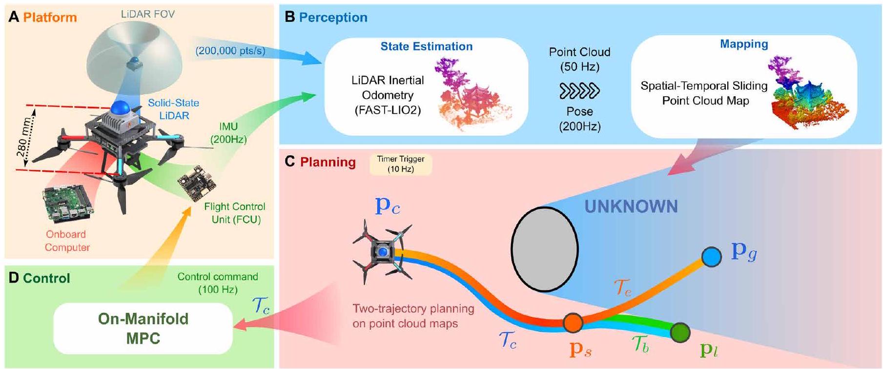 图7. SUPER系统概览。(A) SUPER硬件配置。(B) 感知模块由状态估计和建图两部分组成。(C) 规划模块基于点云地图实现安全保障规划。规划轨迹包括探索轨迹 \(\mathcal{T}_{\mathrm{e}}\)(涵盖已知自由空间与未知空间)和备份轨迹 \(\mathcal{T}_{\mathrm{b}}\)(起始于探索轨迹上某状态,完全位于已知自由空间内)。探索轨迹部分和备份轨迹整体组成已提交轨迹 \(\mathcal{T}_{\mathrm{c}}\),由MAV执行。(D) 控制模块为精准高效的优化模型预测控制(OMMPC)。