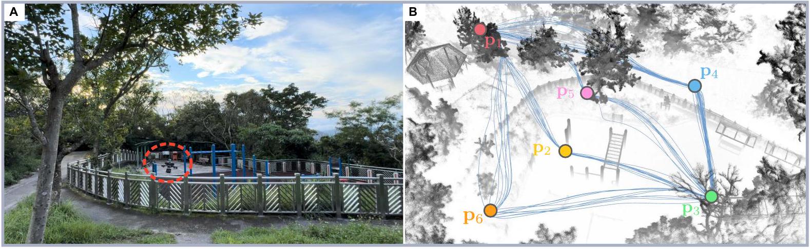 最后,我们测试了SUPER在动态环境中的飞行能力(图2F)。基于点云的规划方法常见问题是错误地将移动物体经过的空间视为占用,因点云包含移动物体点。SUPER实现了时效性递减点云地图(材料与方法),避免了该问题。实验中,MAV从 \(\mathbf{p}_{s}\) 出发,依次飞越一系列航点(\(\mathbf{p}_{1}\) 至 \(\mathbf{p}_{11}\);见图2F,i),同时两人在同一区域随机移动(图2F,ii)。SUPER成功利用移动物体留下的空闲空间,避免与移动或静止障碍物碰撞,顺利完成所有航点。结果凸显了SUPER在复杂未知环境中的卓越导航能力。