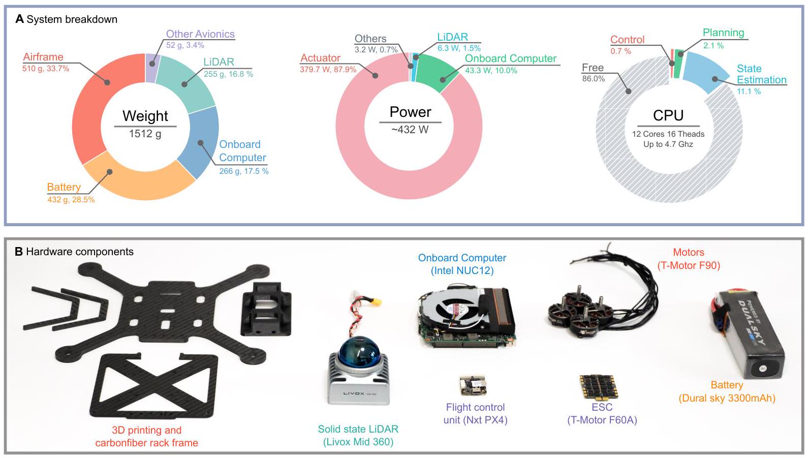 SUPER的设计目标是在尽可能减小尺寸的同时实现高推重比(TWR)。经过全面调研,最终确定了如图7A所示的SUPER设计。该平台起飞重量为1.5公斤,轴距仅280毫米。电机选用T-Motor F90型号(54),单个电机最大推力23.6牛顿,总推力可达94.4牛顿,理论理想推重比约6.3。由于气流干扰和阻塞等因素,实际推重比略高于5.0,支持高度灵活的机动。