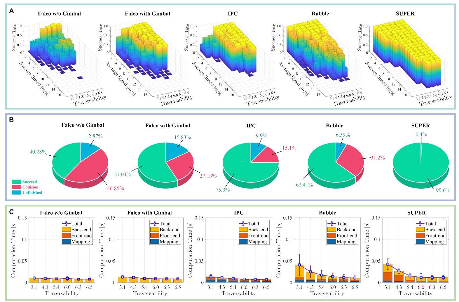 我们在图6B中通过安全率评估了所有基准方法的安全性,安全率定义为成功和未完成案例占所有实验的比例。在1080次不同飞行速度和障碍密度的实验中,SUPER无碰撞且轨迹始终可行,实现了完美的安全率。Faster(23)作为一种安全保障方法,原则上因每次重规划周期中规划备份轨迹,类似于SUPER。但我们发现其备份轨迹未受限于包含未知与占用信息的地图区域,导致地图未及时更新时发生碰撞。Faster碰撞率达12.78%,整体安全率为87.22%。Bubble(13)安全率为68.80%;其余31.20%的碰撞由其将未知空间视为自由的乐观规划策略引起。Raptor(20)碰撞率为38.33%,主要因高速度飞行时规划轨迹频繁违反动力学约束,模拟MAV难以跟踪,导致与障碍碰撞,安全率仅61.67%。综上,SUPER在所有实验中均实现安全飞行,表现优于其他基准方法,凸显其卓越的安全保障特性。