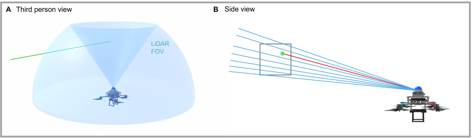 Fig. S5. OGM 上细线检测的视觉示例 (A) 无人机面对细线(绿色显示)的第三人称视角。 (B) 检测过程的侧视图。灰色框代表占据栅格地图(OGM)中包含细线的栅格。蓝线表示穿过该栅格但未击中细线的 LiDAR 光束,红线表示击中细线的光束。由于大多数光束未检测到细线,该栅格被错误地分类为自由空间。