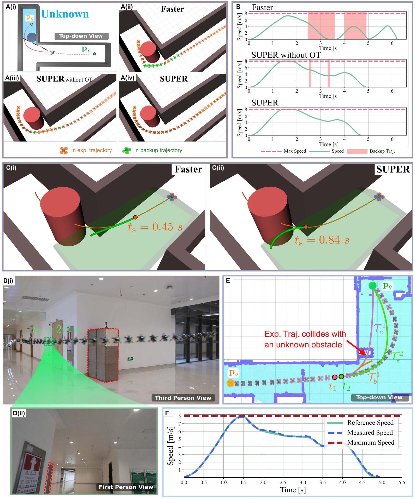 我们通过大量仿真和真实环境实验,展示了SUPER的安全高速飞行能力。在超过1000次的模拟飞行中,SUPER的规划模块相比最先进的基线方法,将失败率降低了35.9至95.8倍,同时实现了显著更高的平均飞行速度。SUPER在真实场景中的性能也通过大量实地测试得到了验证。在所有实验中,SUPER需在完全机载感知、规划和控制的条件下,到达目标位置。连接目标与MAV当前位置的直线通常不安全且会碰撞,且环境在飞行前完全未知,要求SUPER在线检测并避开环境中的障碍物。在这些真实环境测试中,SUPER在未知、无结构环境中达到了 \(20 \mathrm{~m} / \mathrm{s}\) 的飞行速度,并在八次不同试验中保持了100%成功率(见图1B,i)。此外,SUPER在飞行安全方面优于先进商用MAV,能更好地避开细小障碍物,且适应高度杂乱和低光照环境。尤其是SUPER能够探测并避开野外的细小物体,如电力线和树枝(图1B,ii),并穿越极其杂乱的环境(图1B,iii),甚至在夜间飞行(图1B,iv)。SUPER还成功应用于目标跟踪、自主探索和航点导航任务(见图2),展示了其在真实场景中的鲁棒性和多功能性。部分飞行视频见影片1。