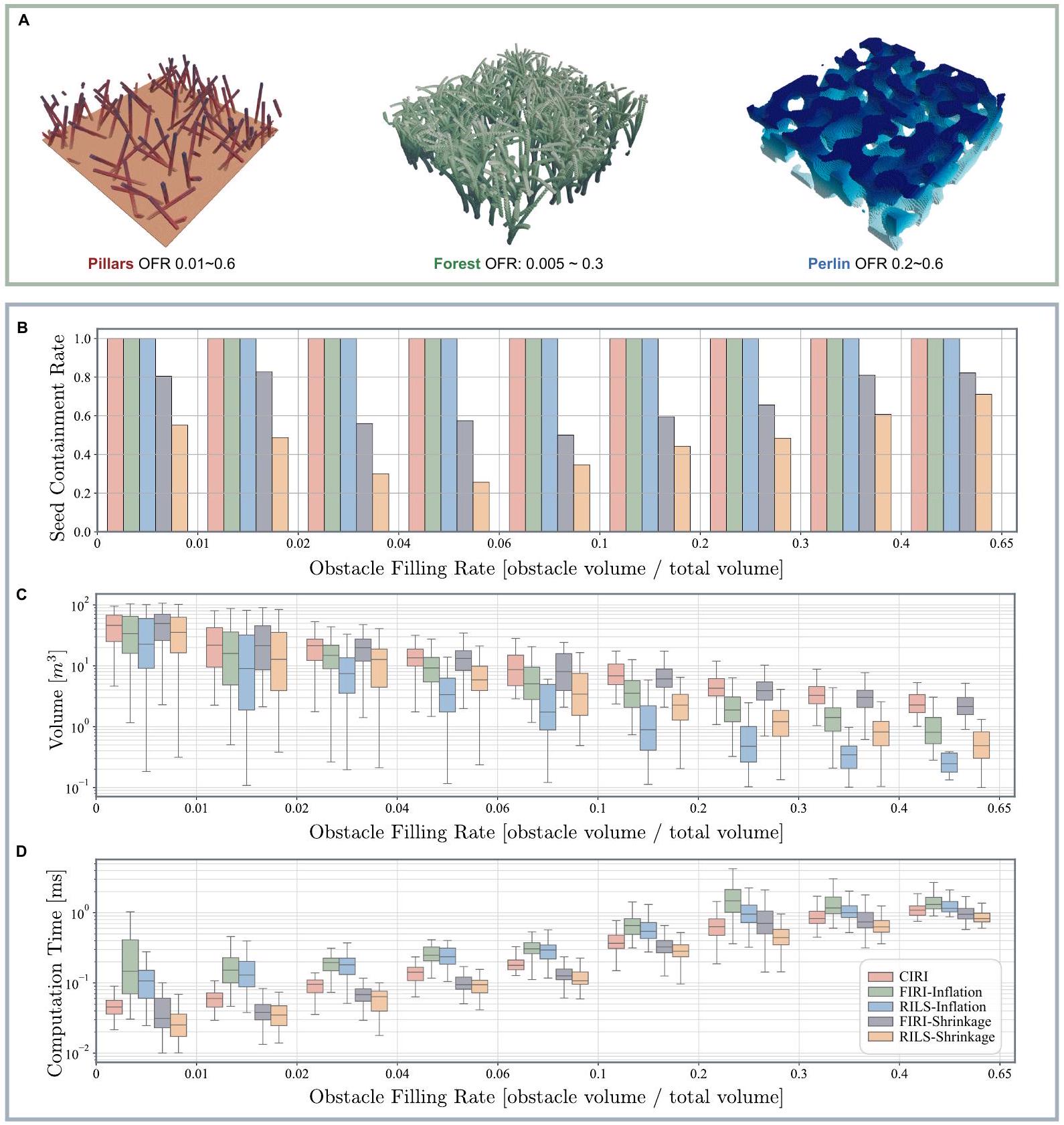 凸分解需在机器人场景空间中进行以考虑无人机体积。现有方法如快速迭代区域膨胀(FIRI)(58)、带线搜索的区域膨胀方法(40)及其前身带半正定规划的迭代区域膨胀方法(59)通过点膨胀或平面收缩处理机器人体积。我们提出场景空间迭代区域膨胀 (CIRI) 新方法。CIRI继承了FIRI(58)中的迭代优化过程及基于二阶锥规划的最大内接椭圆体积算法,但区别于前述方法(59,40,58),CIRI直接对输入点云操作,在无人机场景空间内提取多面体,无需先验地图膨胀(3,12,60)或多面体收缩(40,61)。此外,CIRI采用平面调整策略,确保场景空间生成的多面体包含线段种子。相较于现有点膨胀和平面收缩策略(62,58),CIRI获得的多面体体积更大,计算时间更短,且保证场景空间中完全包含线段种子(见图S8)。CIRI方法细节见补充材料。