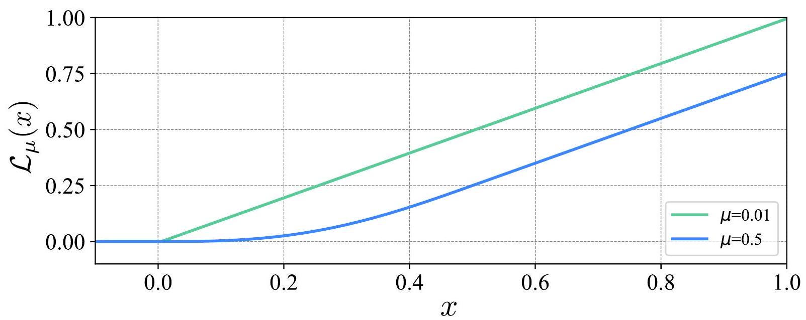 Fig. S9. 障碍函数 \(\mathcal{L}_{\mu}\) 的绘图。图示了函数 \(\mathcal{L}_{\mu}\)。随着参数 \(\mu\) 从 \(\mu=0.5\) 降至 \(\mu=0.01\),障碍函数逐渐变得更陡峭,形状更尖锐。