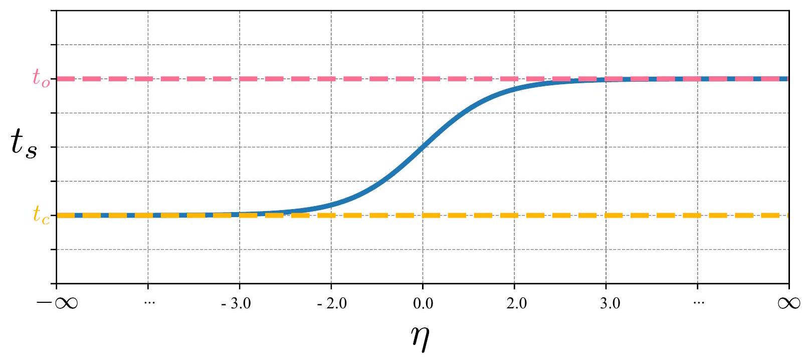 Fig. S10. 从 \(\eta\) 到 \(t_{s}\) 的映射绘图。图示一个类似 Sigmoid 的函数,将 \(\eta \in \mathbb{R}\) 映射到区间 \(\left(t_{c}, t_{o}\right)\)。