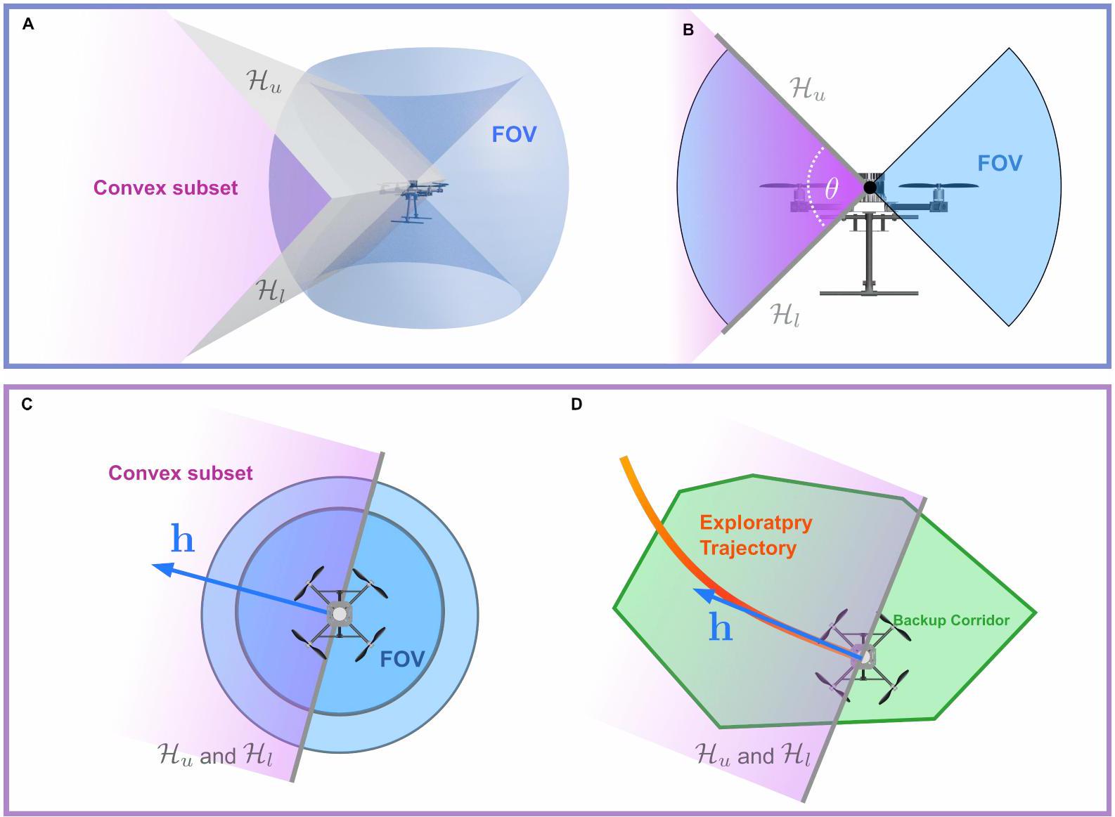 探索轨迹和备份轨迹均通过走廊约束轨迹优化规划。该方法先生成飞行走廊,再在走廊内优化平滑轨迹(图8A)。飞行走廊由一系列凸形状(如立方体(56)、球体(13,41)、多面体(40,23,12))表示从起点至目标的无碰撞空间。在双轨迹框架中,需生成两个多面体走廊:探索走廊涵盖已知自由空间和未知空间,备份走廊仅涵盖已知自由空间。随后在各自走廊内优化探索和备份两条平滑轨迹。后续章节将介绍如何基于激光雷达点云直接生成探索和备份走廊,以及如何在走廊内优化平滑轨迹。