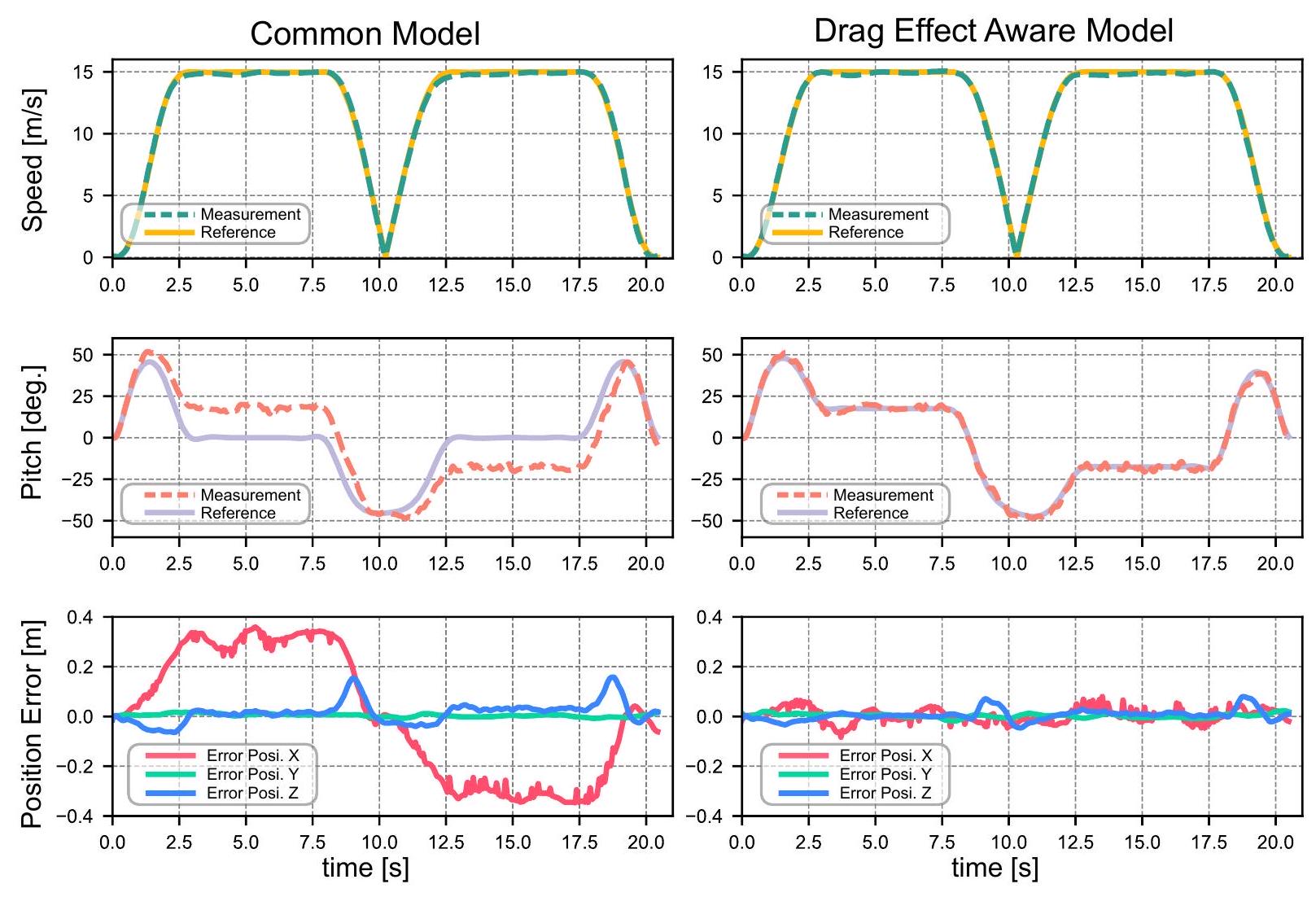 Fig. S13. 不同无人机模型下 MPC 跟踪性能比较。速度、俯仰角和各轴位置跟踪误差的绘图。