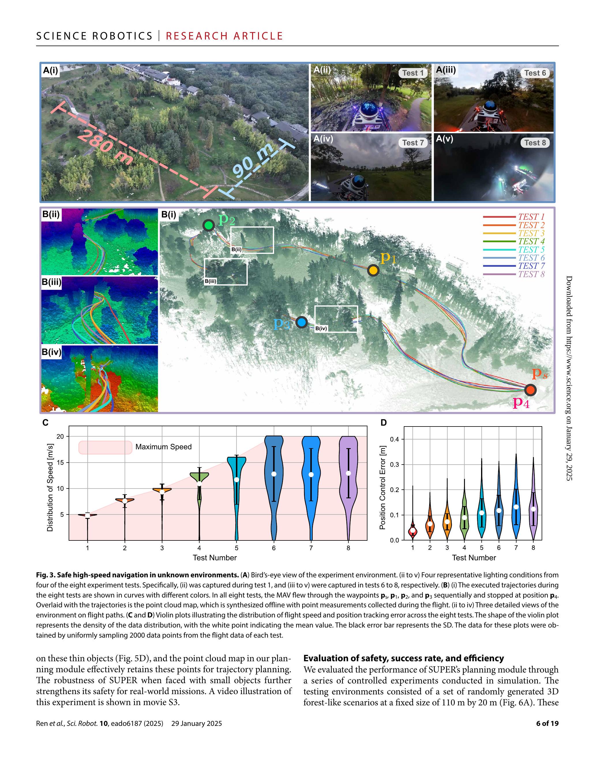 我们在未知森林环境中测试了SUPER的飞行速度(见图3和影片S1)。环境面积约为280×90平方米,树木粗细不一,植被多样(图3A,i)。我们在不同时间段共进行八次实验,涵盖从明亮白天到全黑夜晚的多种光照条件(图3A,ii至v)。八次实验中设置不同的最大速度限制,范围为5至 \(20 \mathrm{~m} / \mathrm{s}\)。所有实验中,SUPER从位置 \(\mathbf{p}_{s}\) 出发,依次到达四个航点 \(\mathbf{p}_{1} \sim \mathbf{p}_{4}\),其中 \(\mathbf{p}_{4}\) 与 \(\mathbf{p}_{s}\) 重合(图3B,i)。这四个航点引导MAV穿越不同障碍密度区域(图3B,ii至iv)。