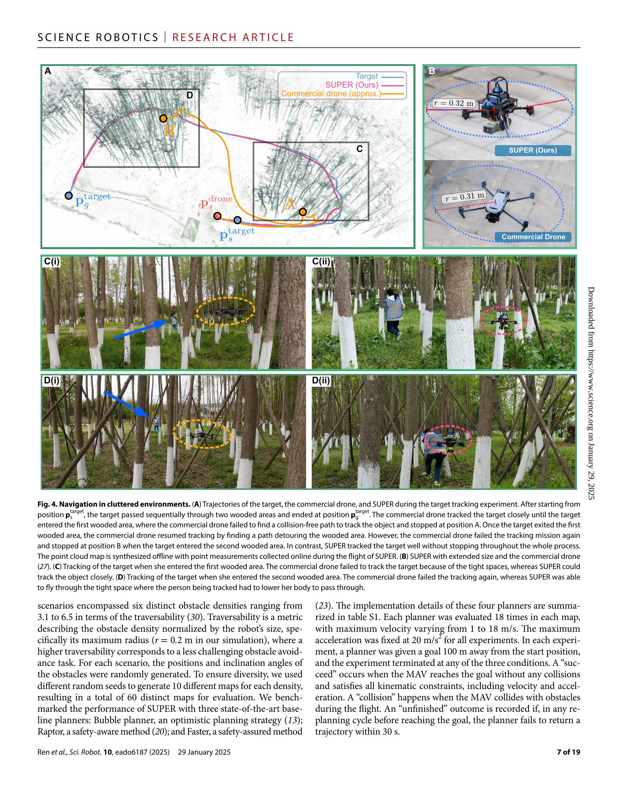 为验证SUPER在复杂环境中的导航能力,我们指令其在密林环境中跟踪慢跑者(图4A)。被跟踪者依次穿越两片林区:第一片树木相对稀疏(图4C),第二片树木密度较大,被跟踪者需降低身体通过(图4D)。我们通过两组独立实验,将SUPER与先进商用产品(27)进行导航和跟踪性能比较。两组实验中,被跟踪者大致沿同一路径和速度行进。考虑到商用无人机体积较SUPER大(半径0.31米对比0.21米),我们通过在SUPER四臂加装四根杆件将其尺寸增加至0.32米,以保证公平比较(图4B)。目标检测与跟踪方面,商用无人机使用视觉识别技术,SUPER则无此功能。为解决该问题,目标穿戴高反射背心,基于激光雷达点云的反射率测量,易于检测。两系统在整个任务中均成功检测并跟踪目标,确保导航能力的公平对比。