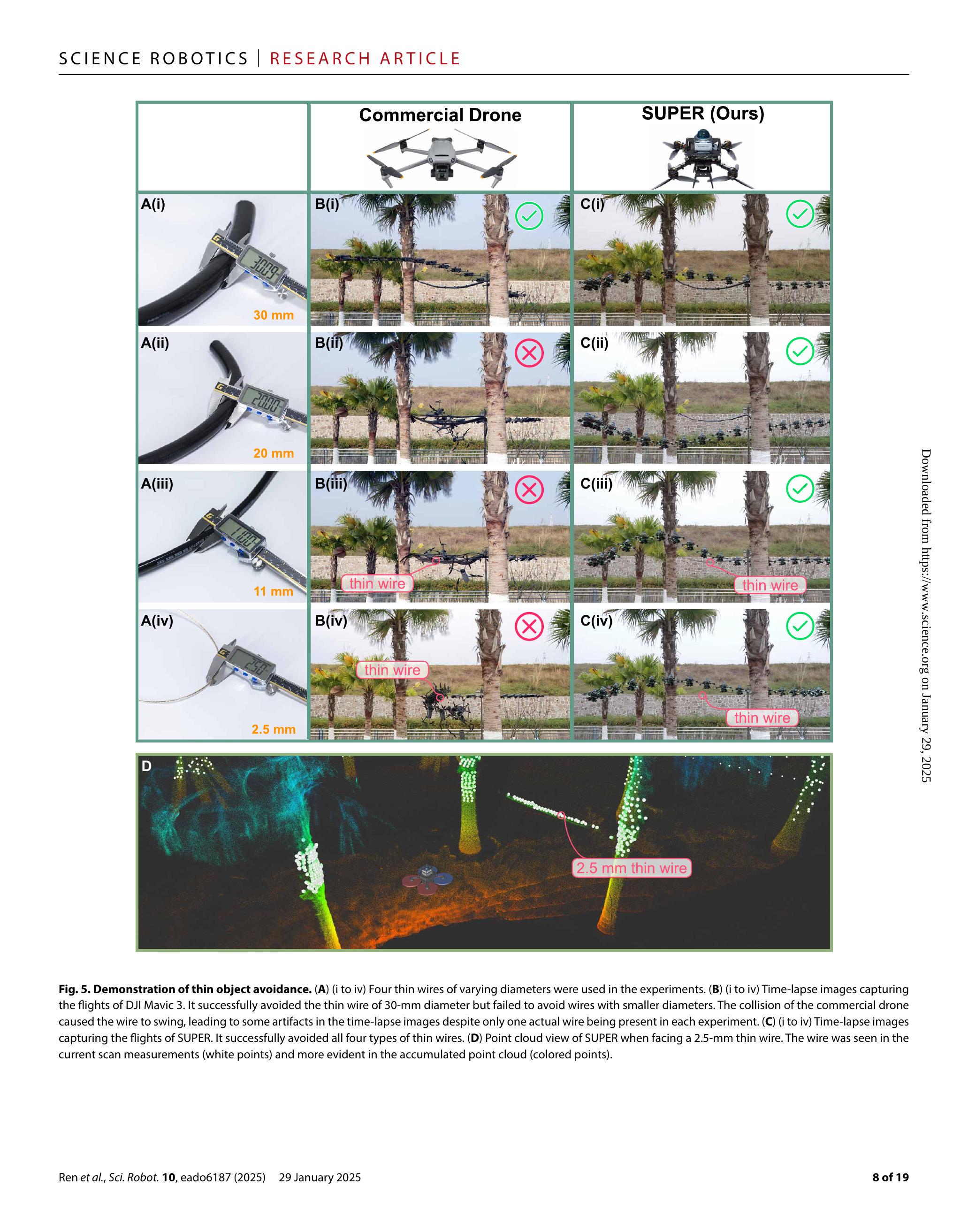 细小物体如电力线和树枝在野外任务中频繁出现且难以探测,对MAV构成挑战。为验证SUPER避开小物体的能力,我们开展一系列定量实验,并与商用无人机(27)性能进行对比。图5显示,我们选择了四根不同直径的细线:30、20、11和2.5毫米(图5A)。这些细线挂于两棵约3米间距的树间。为测试避开细线能力,MAV从细线一侧4米处起飞,目标位置设在对侧4米远。由于商用无人机不支持航点指令,我们使用操纵杆指令其从起点飞向目标。为测试商用无人机是否能探测并避开飞行路径上的细线,我们在飞行时开启其高级飞行员辅助系统(APAS)。飞行速度约为2至3 m/s,该速度也作为SUPER的速度约束,以确保公平比较。