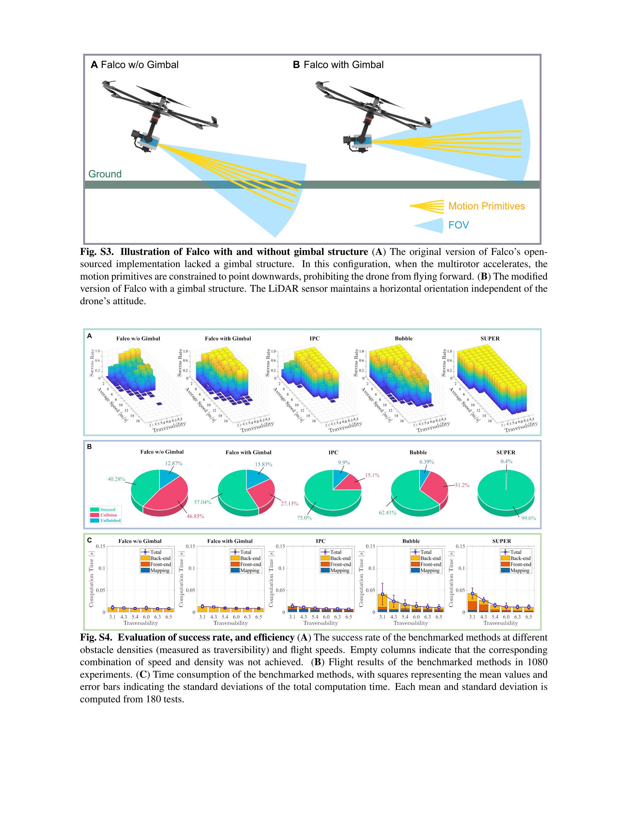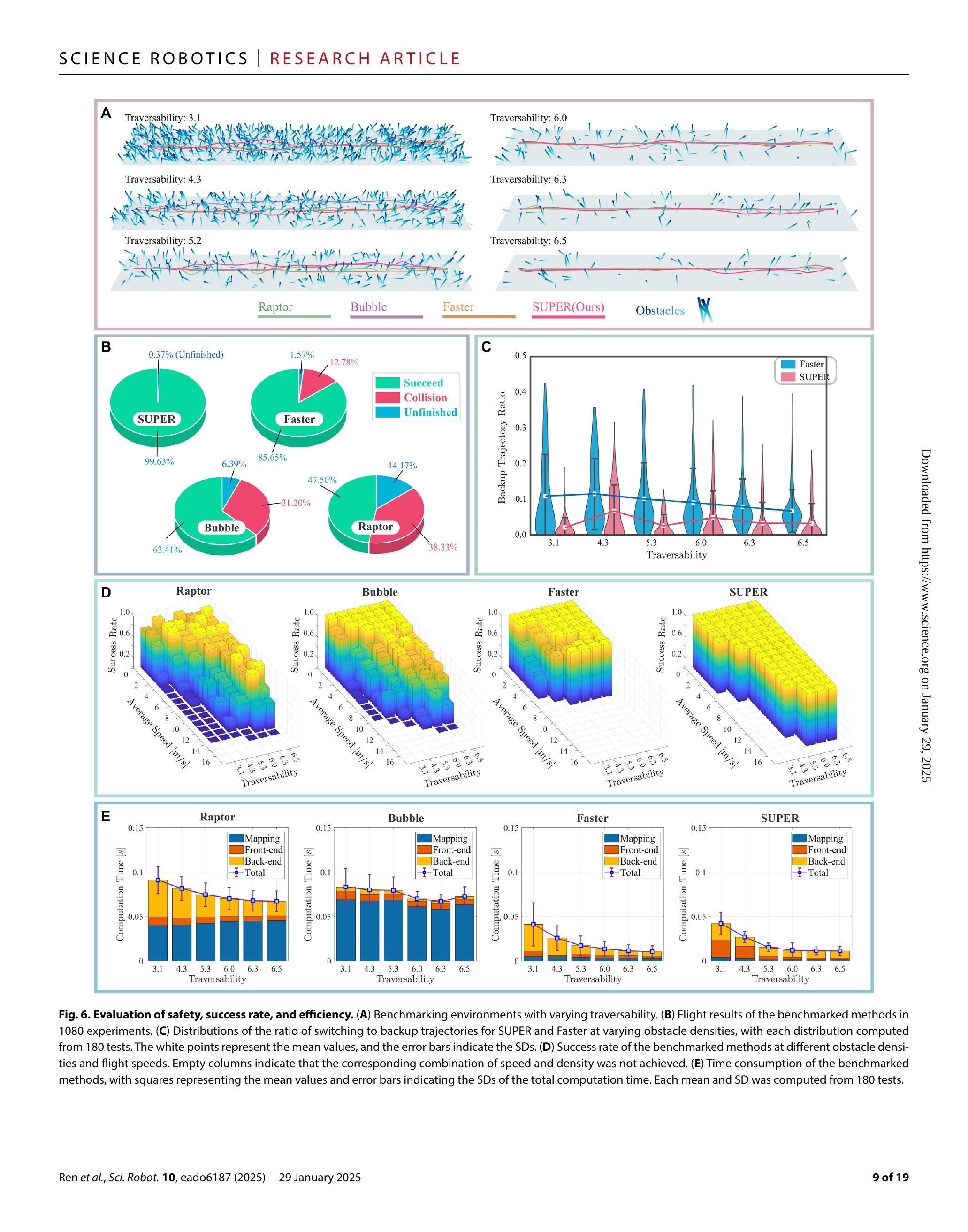 我们在图6B中通过安全率评估了所有基准方法的安全性,安全率定义为成功和未完成案例占所有实验的比例。在1080次不同飞行速度和障碍密度的实验中,SUPER无碰撞且轨迹始终可行,实现了完美的安全率。Faster(23)作为一种安全保障方法,原则上因每次重规划周期中规划备份轨迹,类似于SUPER。但我们发现其备份轨迹未受限于包含未知与占用信息的地图区域,导致地图未及时更新时发生碰撞。Faster碰撞率达12.78%,整体安全率为87.22%。Bubble(13)安全率为68.80%;其余31.20%的碰撞由其将未知空间视为自由的乐观规划策略引起。Raptor(20)碰撞率为38.33%,主要因高速度飞行时规划轨迹频繁违反动力学约束,模拟MAV难以跟踪,导致与障碍碰撞,安全率仅61.67%。综上,SUPER在所有实验中均实现安全飞行,表现优于其他基准方法,凸显其卓越的安全保障特性。